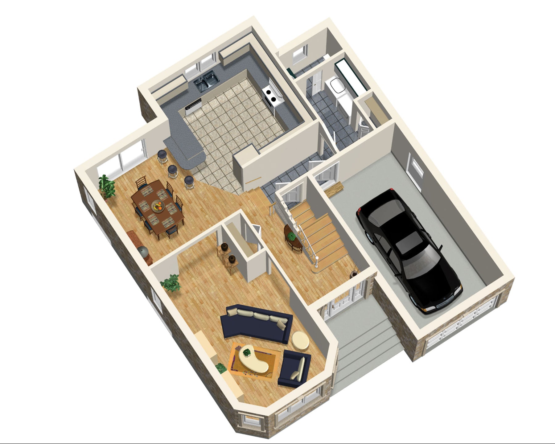 The ground floor has an 837 square foot living area and includes a living room, an open kitchen and dining room, a powder room with a laundry area, and a 243 square foot one-car garage.