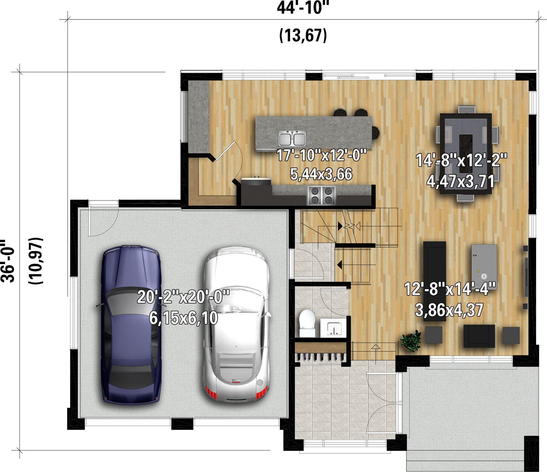 | Front | 44 ft 10 in | Total living surface | 1966 ft² |
