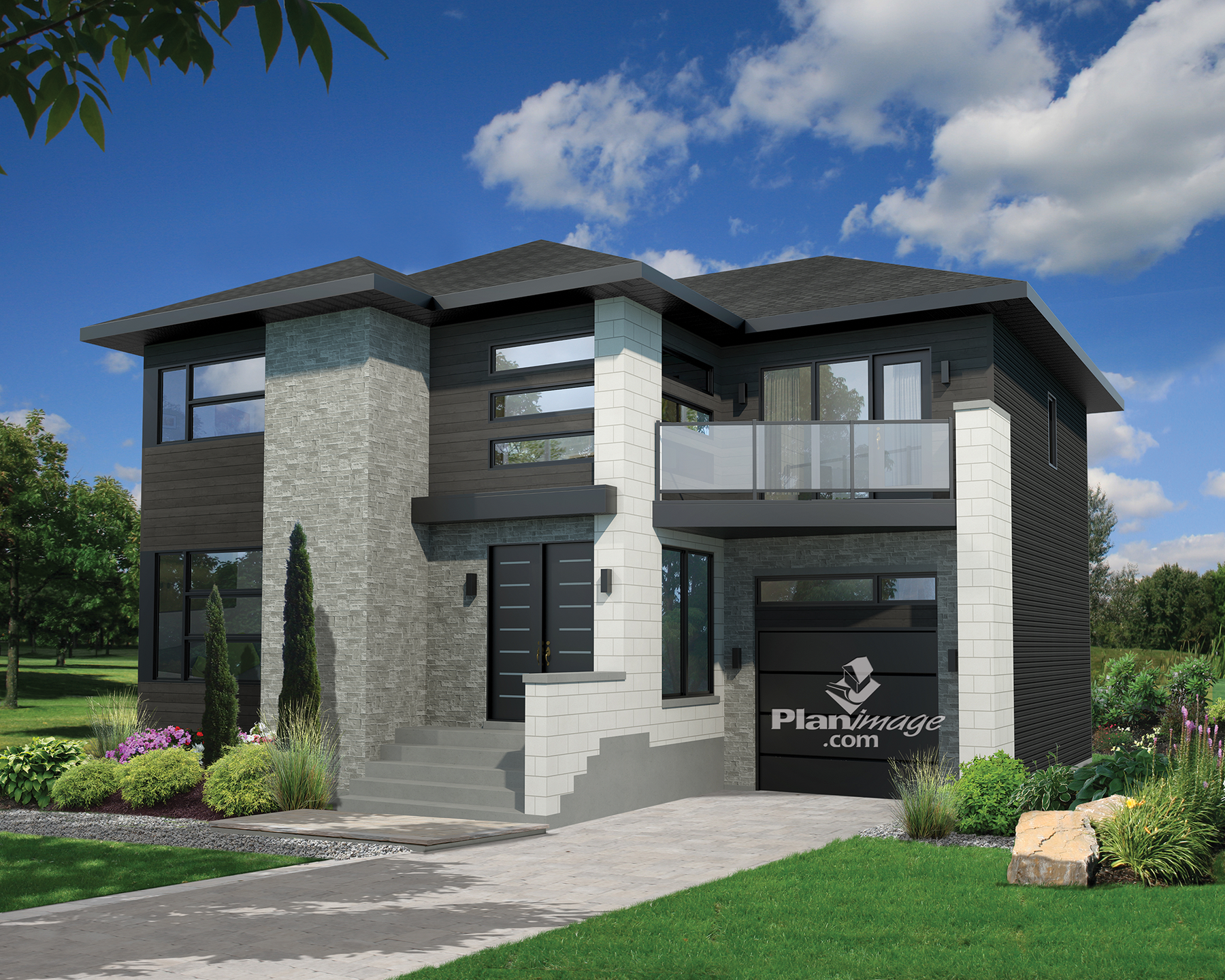 This impressive ultra-modern two-storey house stands out with its unique architectural details and a lovely glass balcony in the front. The home is 40 feet 5 inches wide by 40 feet deep, and provides 2,317 square feet of living space including a 364 square-foot one-car garage.