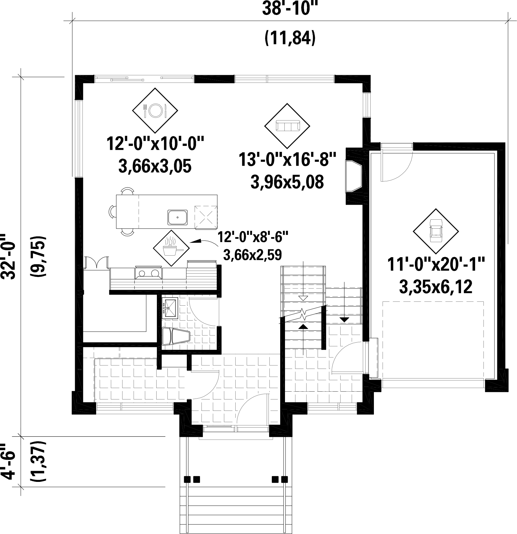 The porch and the tall narrow windows give this two storey house a unique and contemporary look. It is 38 feet 10 inches wide by 32 feet long, offering a living area of 1,866 sq. ft. It's also equipped with a 264 sq. m. ft. single car garage.