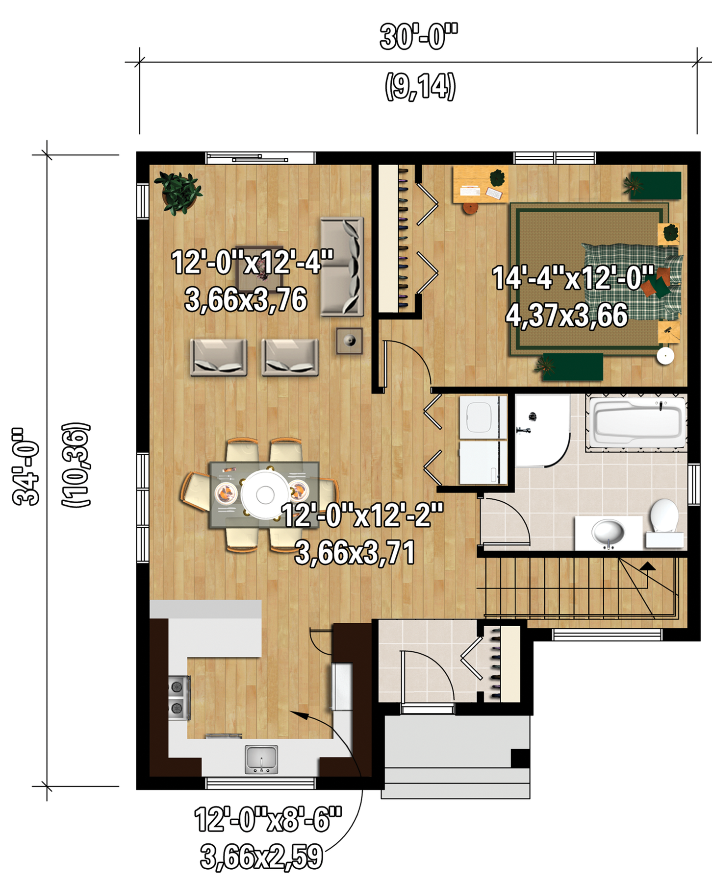 This urban home is 30 feet wide by 34 feet deep and provides 926 square feet of living space.