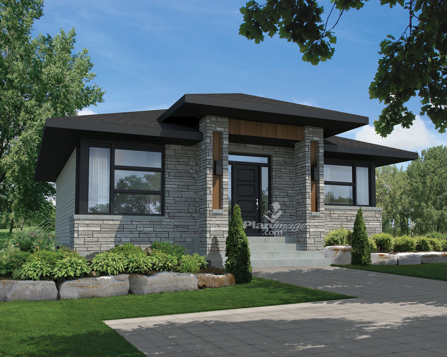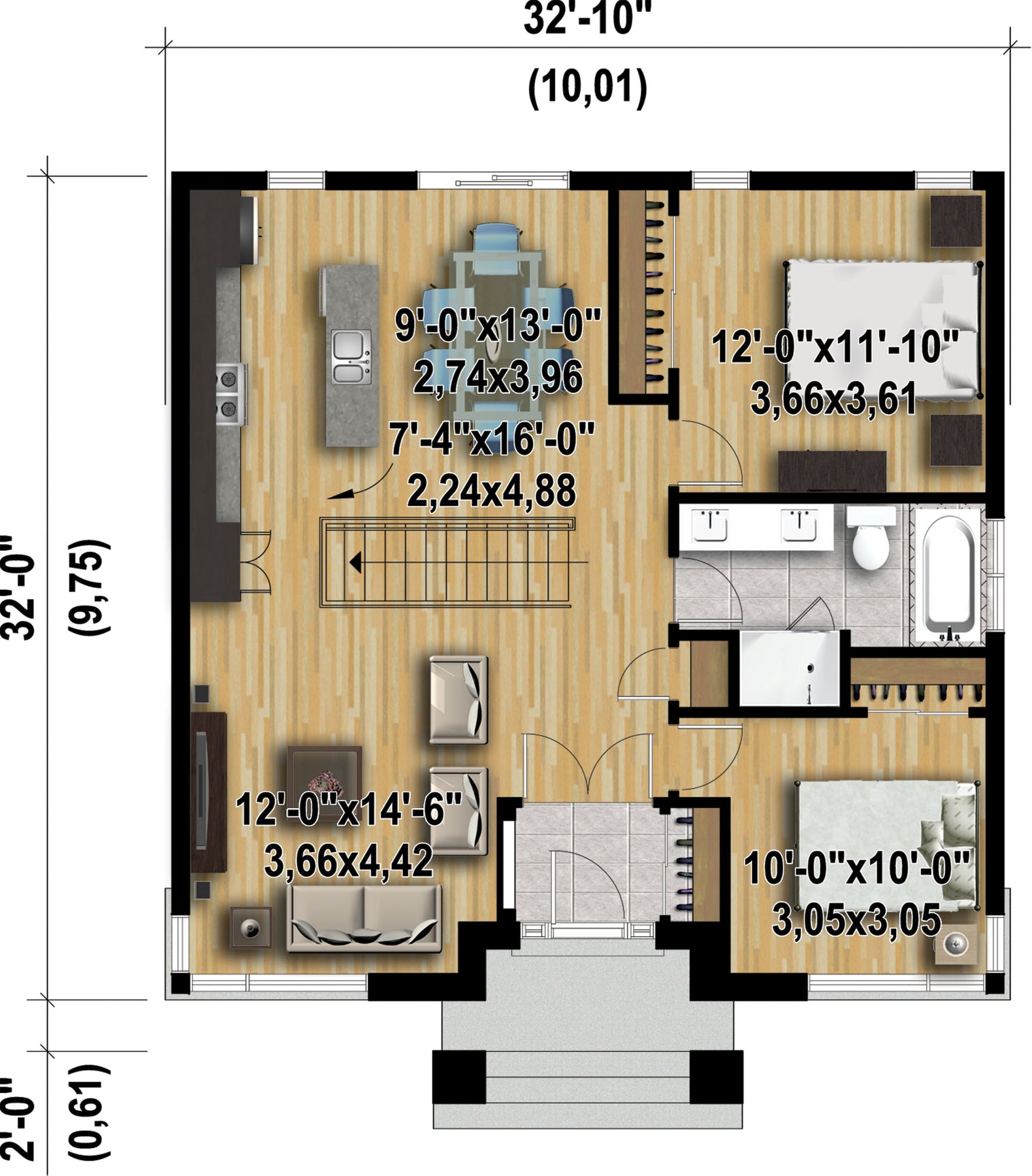 Equipped with an imposing porch overlooking the entrance and supported by large stone columns with wood inlays, this contemporary bungalow is 32 feet 10 inches wide by 32 feet deep, and provides 1,012 square feet of living space. The open-concept home features a closed entrance hall and nine foot-high ceilings and includes a laboratory-type kitchen with an island equipped with a sink, a dining room, a living room, two bedrooms, and a bathroom with a podium bathtub and a separate shower.