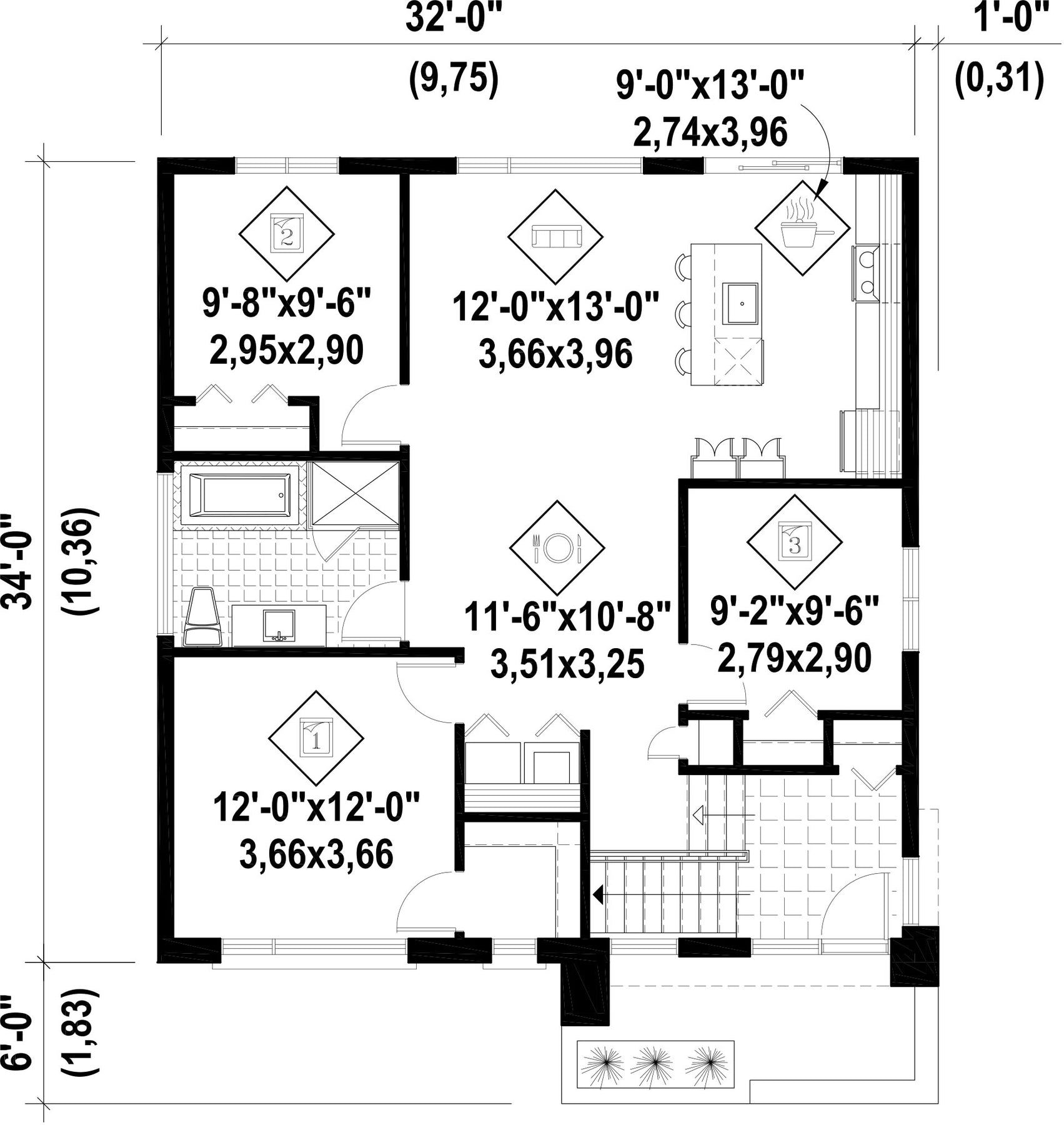 | Front | 32 ft | Total living surface | 1088 ft² |