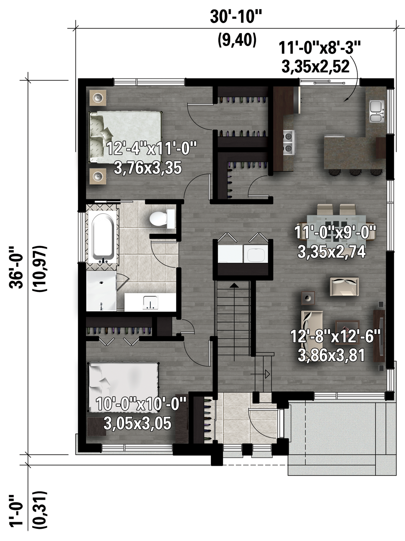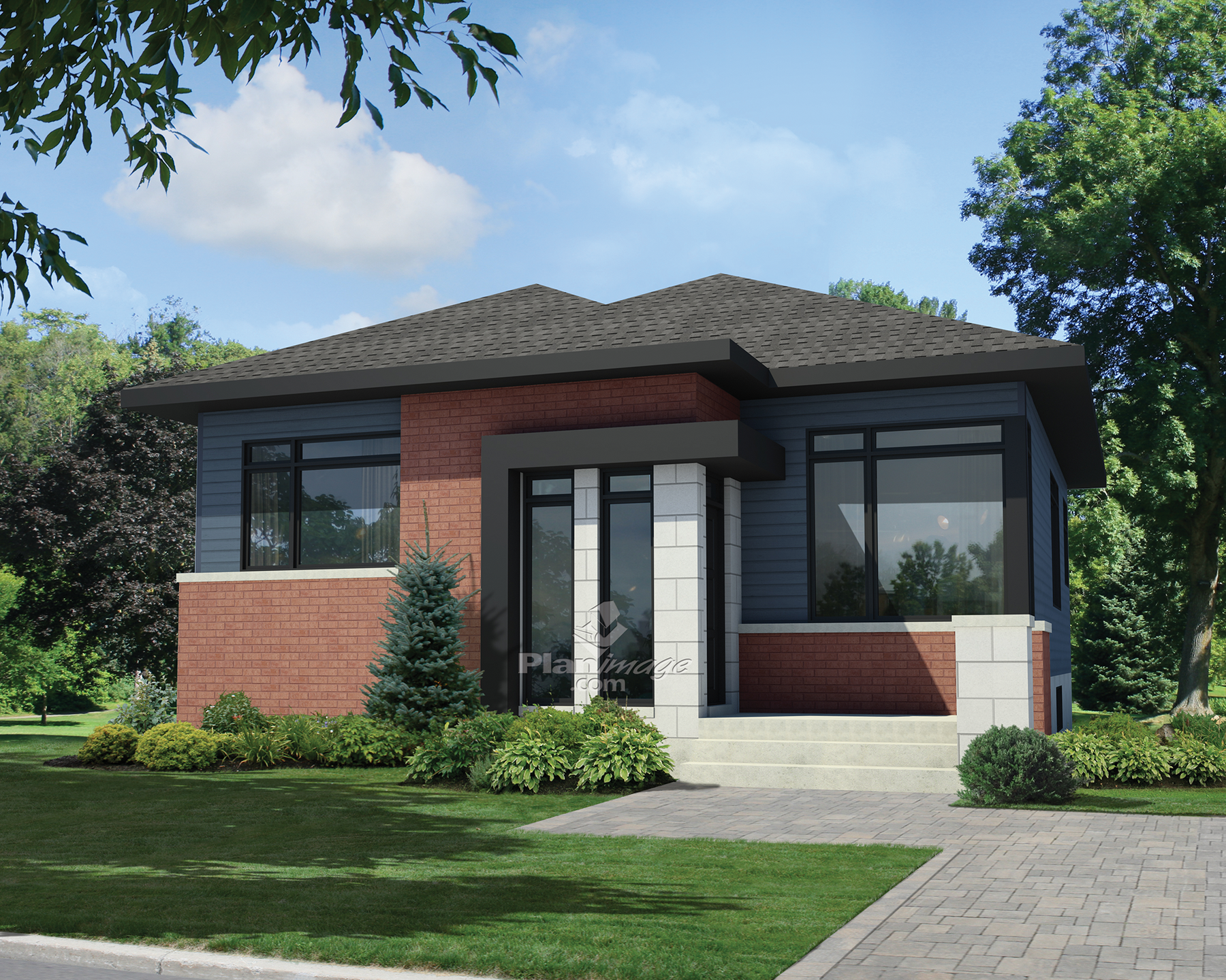 With a sunken entrance and a side door, this bungalow displays an urban architecture that will appeal to young families. The house is 30 feet 10 inches wide by 36 feet deep and provides 1,032 square feet of living space.