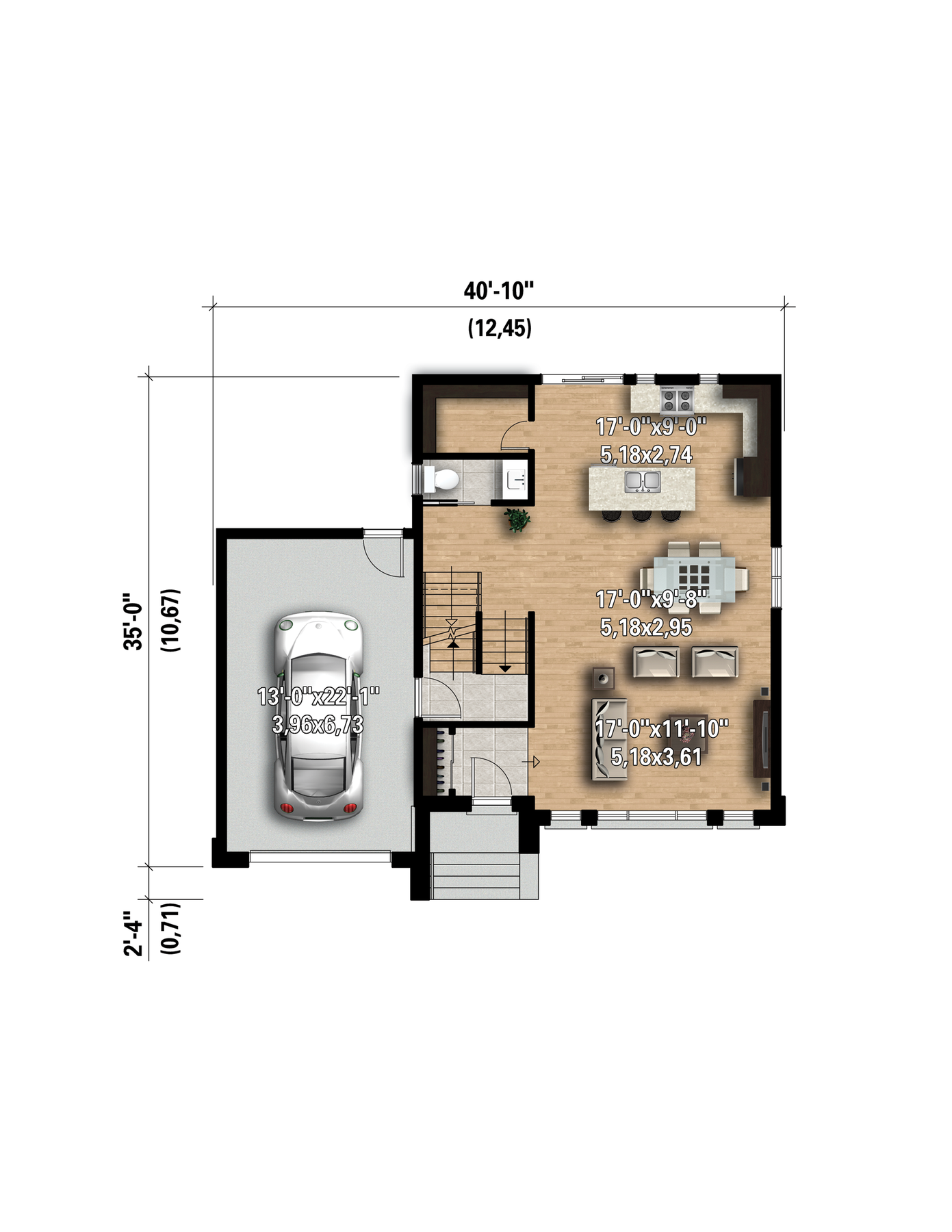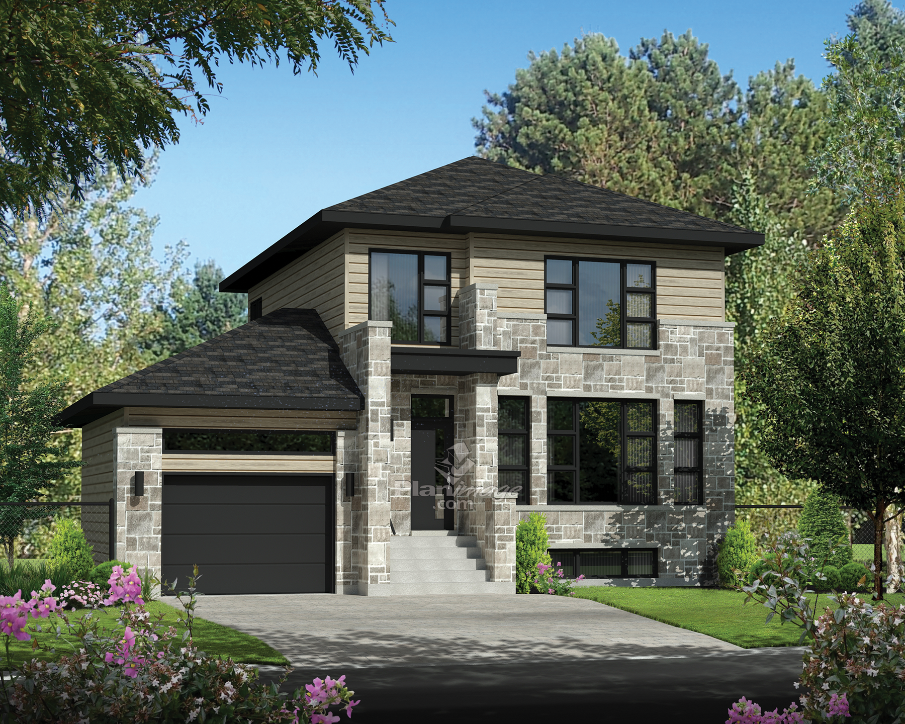 This compact two-storey house is very functional for a family as an additional room can eventually be built above the garage. The home provides 1,648 square feet of living space, it is 40 feet 10 inches wide by 35 feet deep, and includes a 341 square-foot one-car garage.