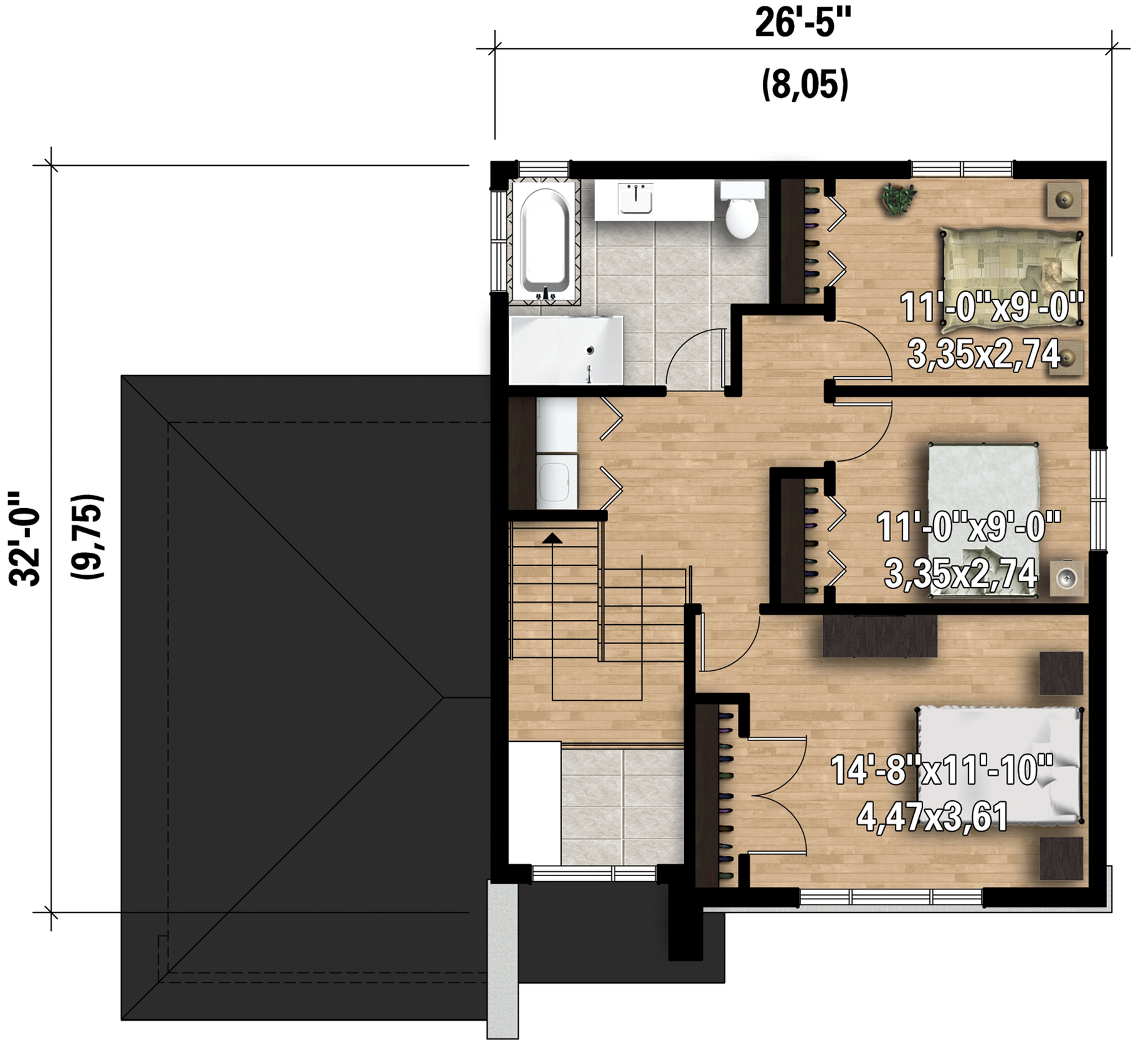 With 822 square feet of living space, the upper floor includes a bathroom with a large ceramic shower, a closet for the washer and dryer, and three bedrooms.