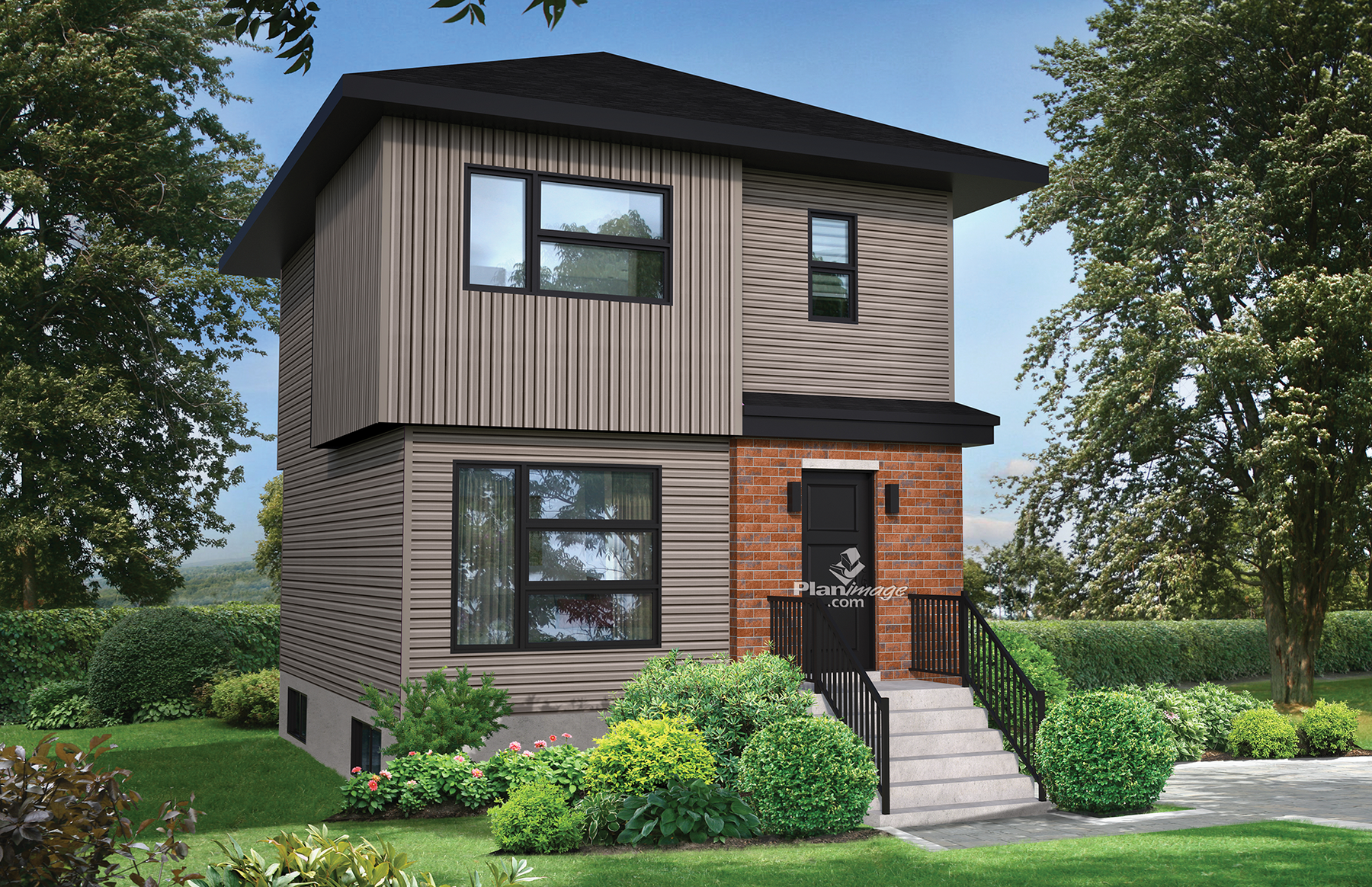 This urban two-storey house has an elegant facade of vertical and horizontal brick and aluminum siding. The compact house is 20 feet wide by 22 feet 5 inches deep and provides 947 square feet of living space. See plan #21545 for a different design option of the second storey.