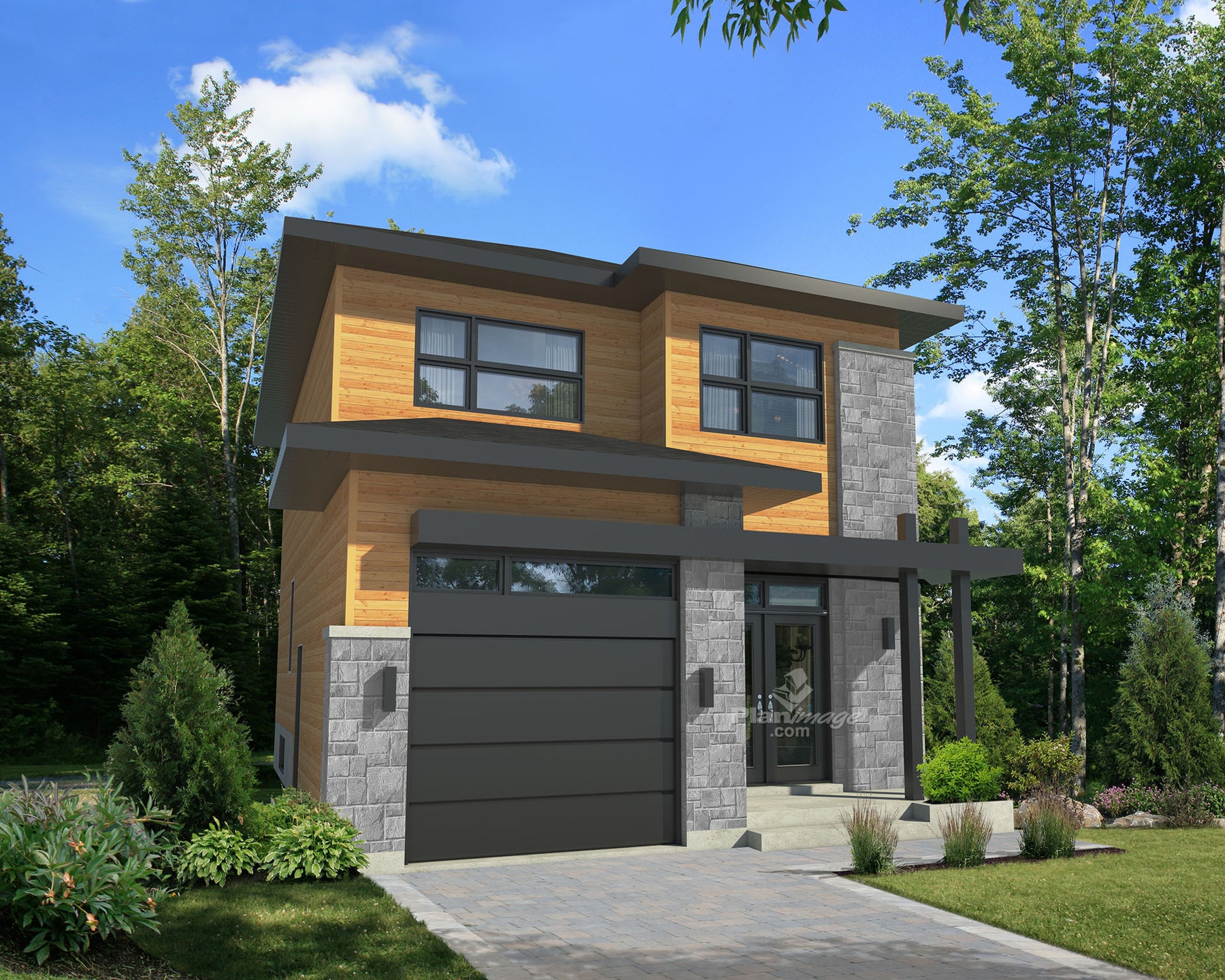This elegant two-storey house has a definite urban style with its exterior facing of aluminum, stone and wood. The home is 24 feet 10 inches wide by 38 feet deep and has a 1,377 square-foot living area that includes a 268 square-foot one-car garage.