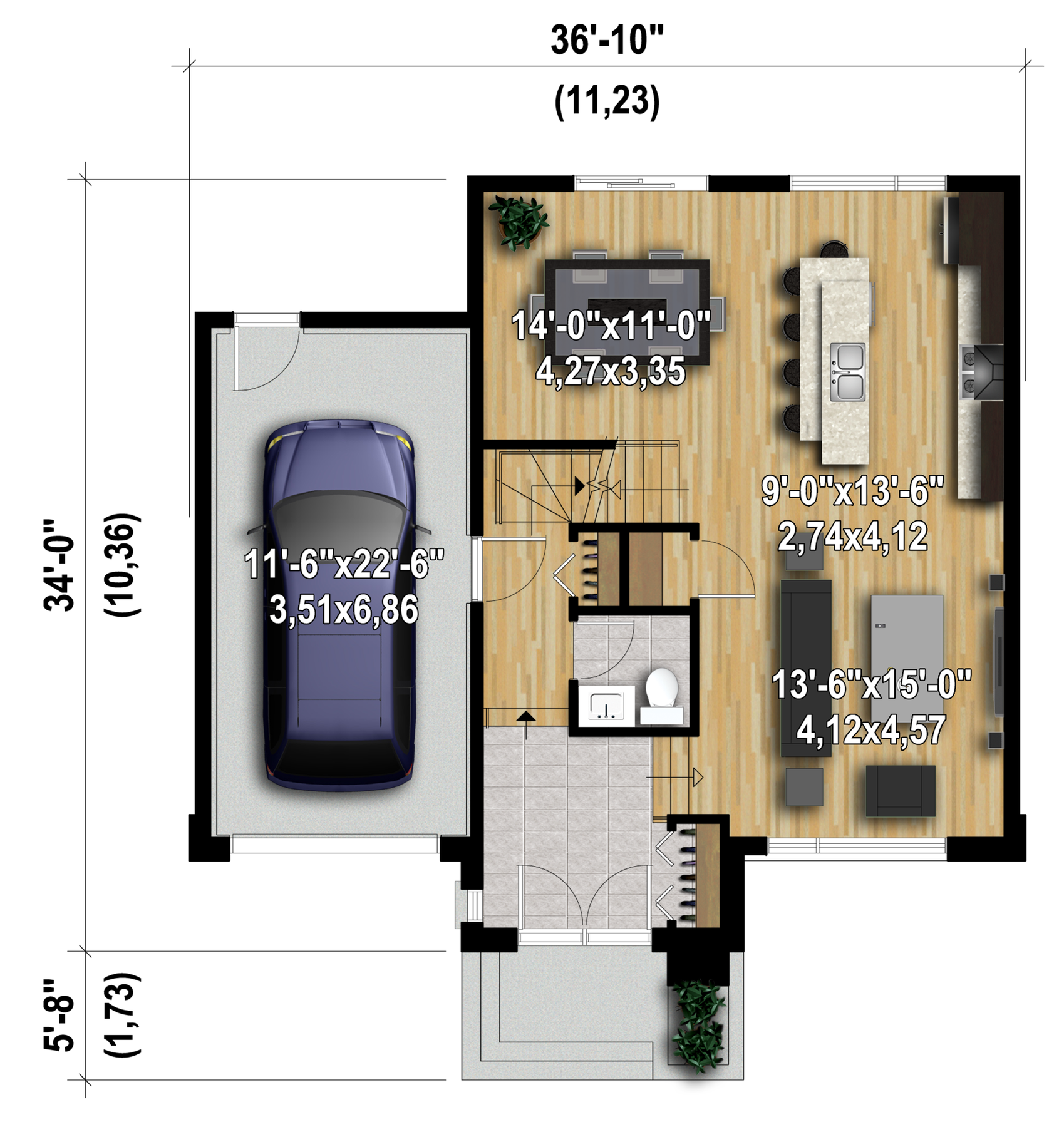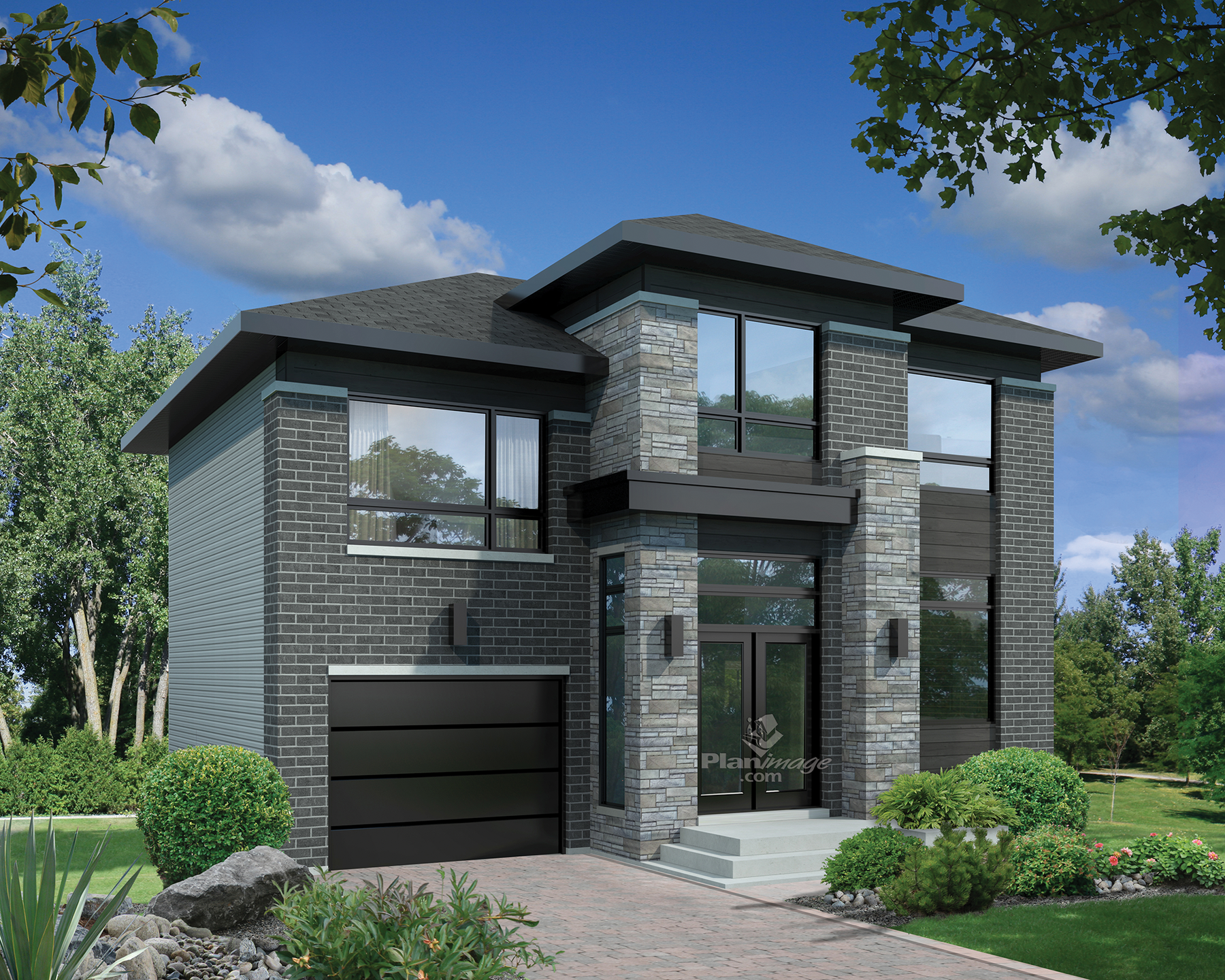 This urban two-storey house features a lovely brick, stone and wood siding facade that will surely attract city dwellers. The home is 36 feet 10 inches wide by 34 feet deep, and provides 1,831 square feet of living space including a 289 square-foot one-car garage.