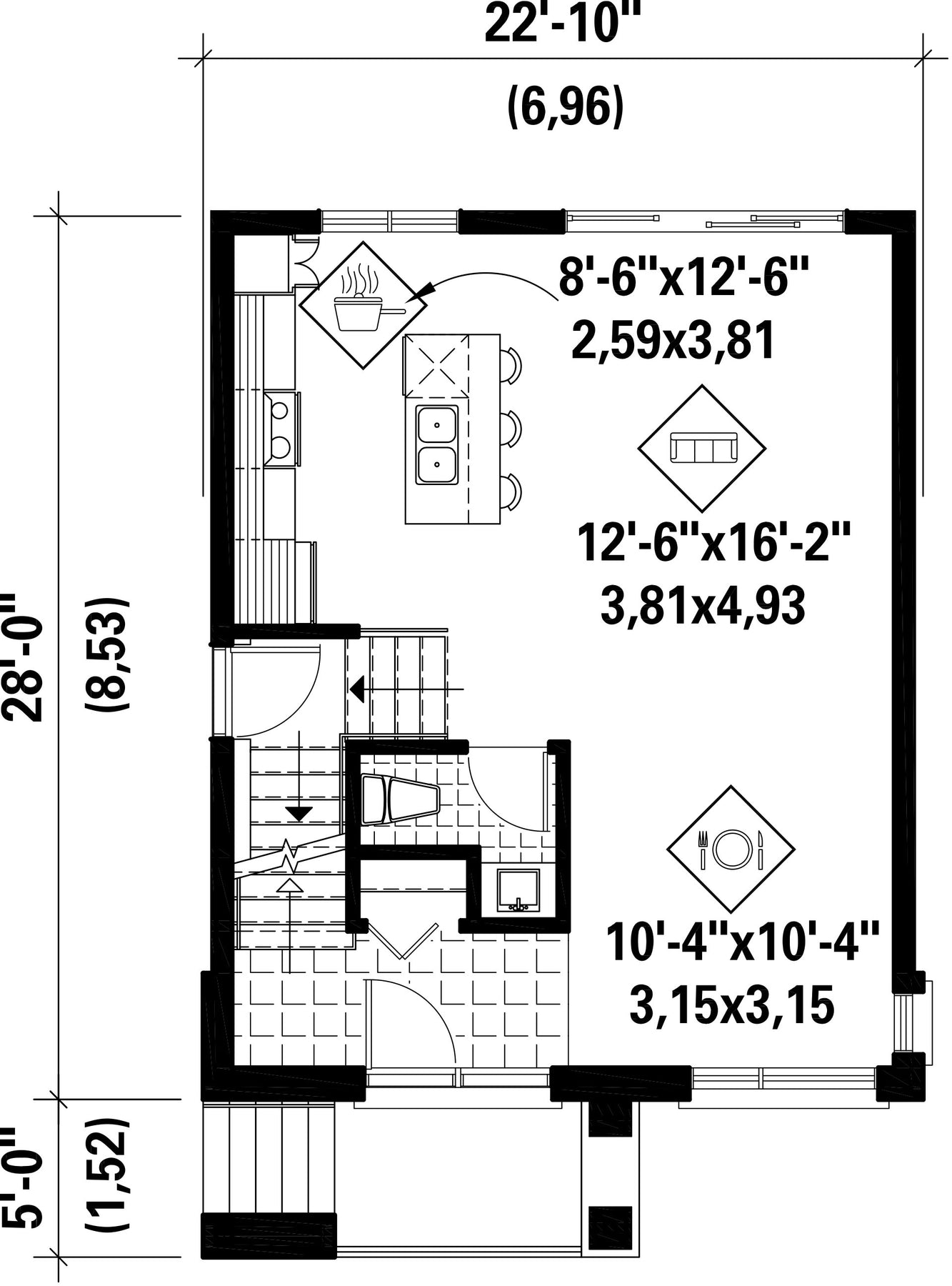 | Front | 22 ft 10 in | Total living surface | 1235 ft² |