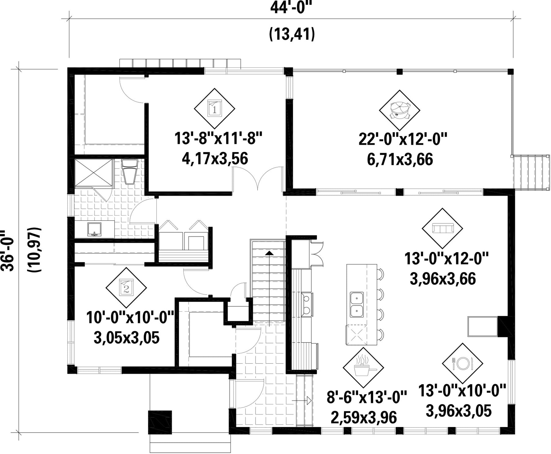 This cottage of 44 feet wide by 36 feet deep will be well located on the edge of a lake. The cottage spans 1224 square feet of living space and has an abundance of windows, and a covered terrace accessible by two patio doors.