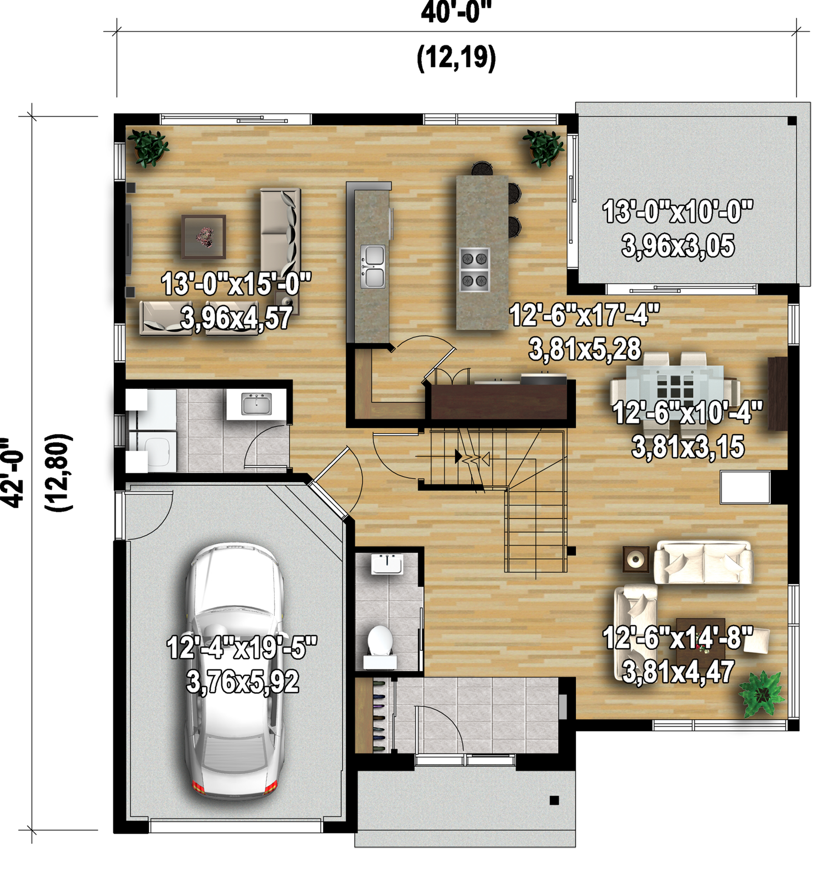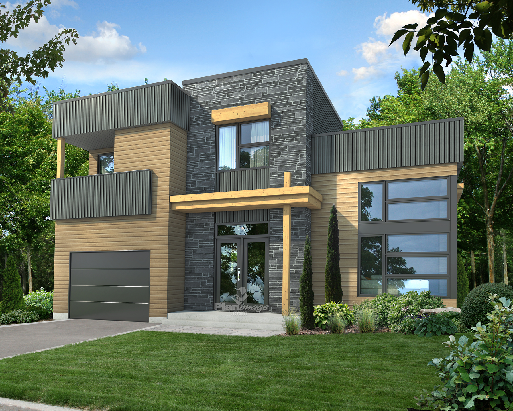This contemporary two-storey house stands out with its flat roof and its stone, wood and steel cladding. Furthermore, thanks to the huge windows, the house is exceptionally bright. The home is 40 feet wide by 42 feet deep and offers 1,755 square feet of living space, as well as a 276 square-foot one-car garage.