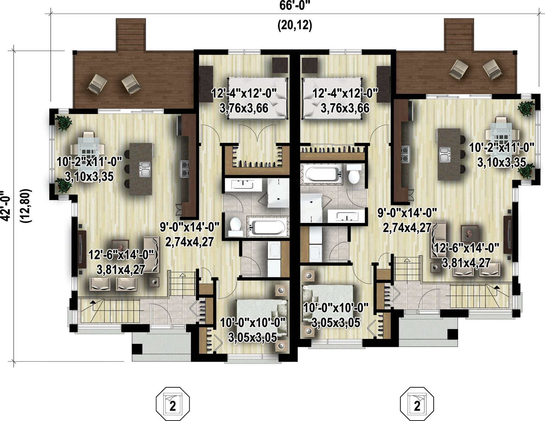 These lovely semi-detached bungalows stand out with their elegant facade. With 1,103 square feet of living space, the house on the left is slightly larger – the master bedroom's walk-in closet and its covered balcony are bigger – than the house on the right, which provides a 1,075 square foot living area. Each unit features a sunny entrance hall, two bedrooms, a living room, a dining room, a kitchen with an island and a sink, a bathroom with a podium bathtub and a separate shower, and a laundry room.