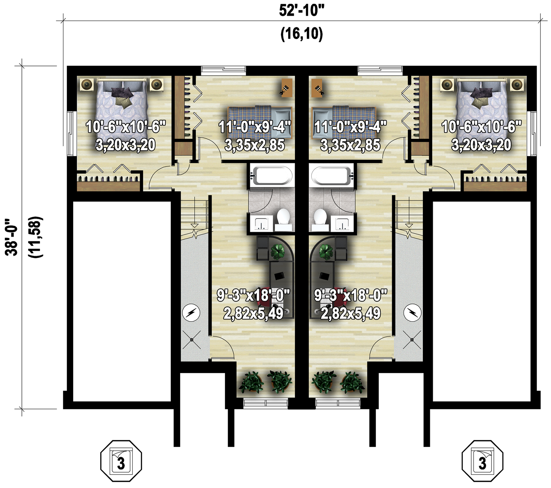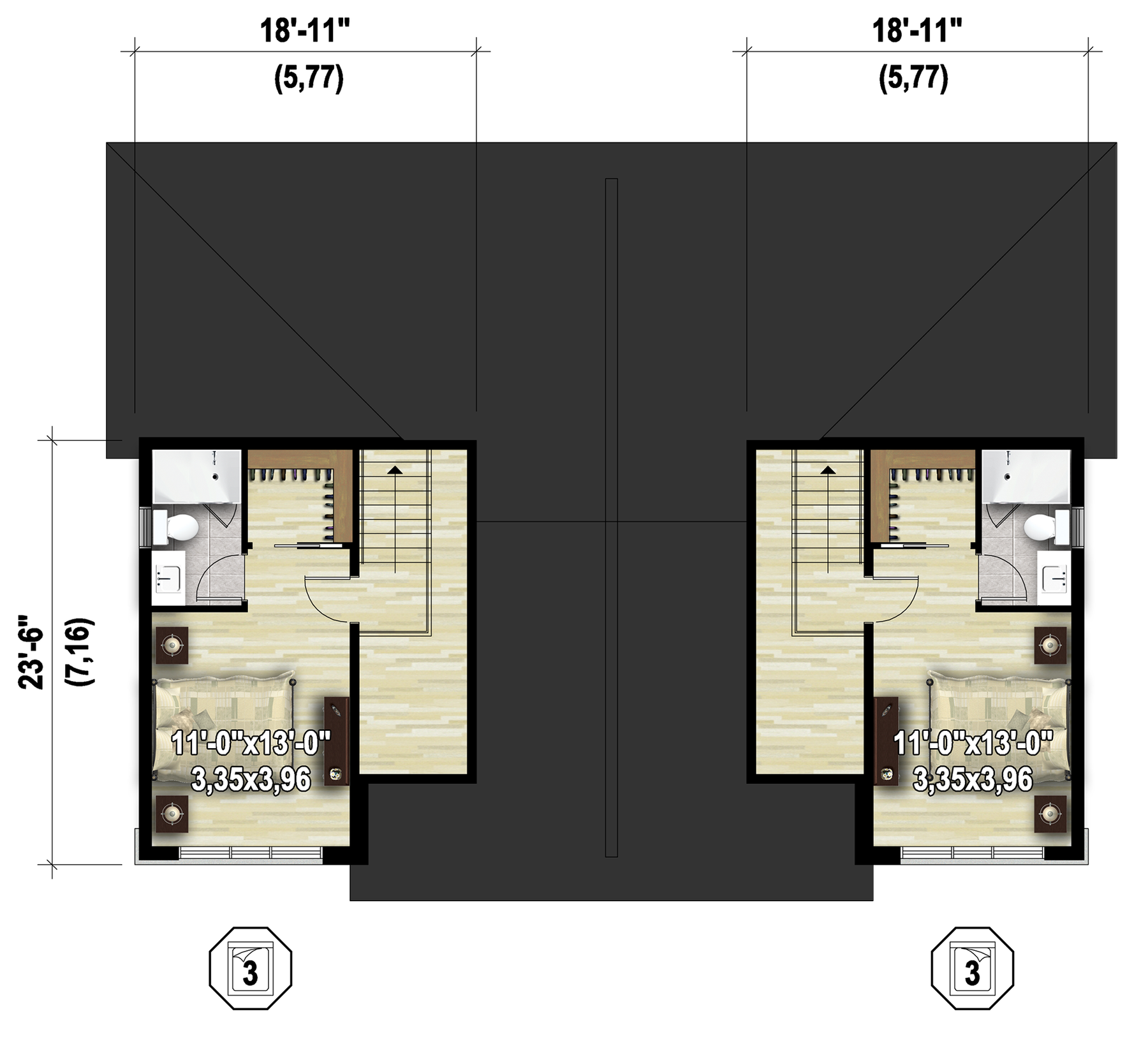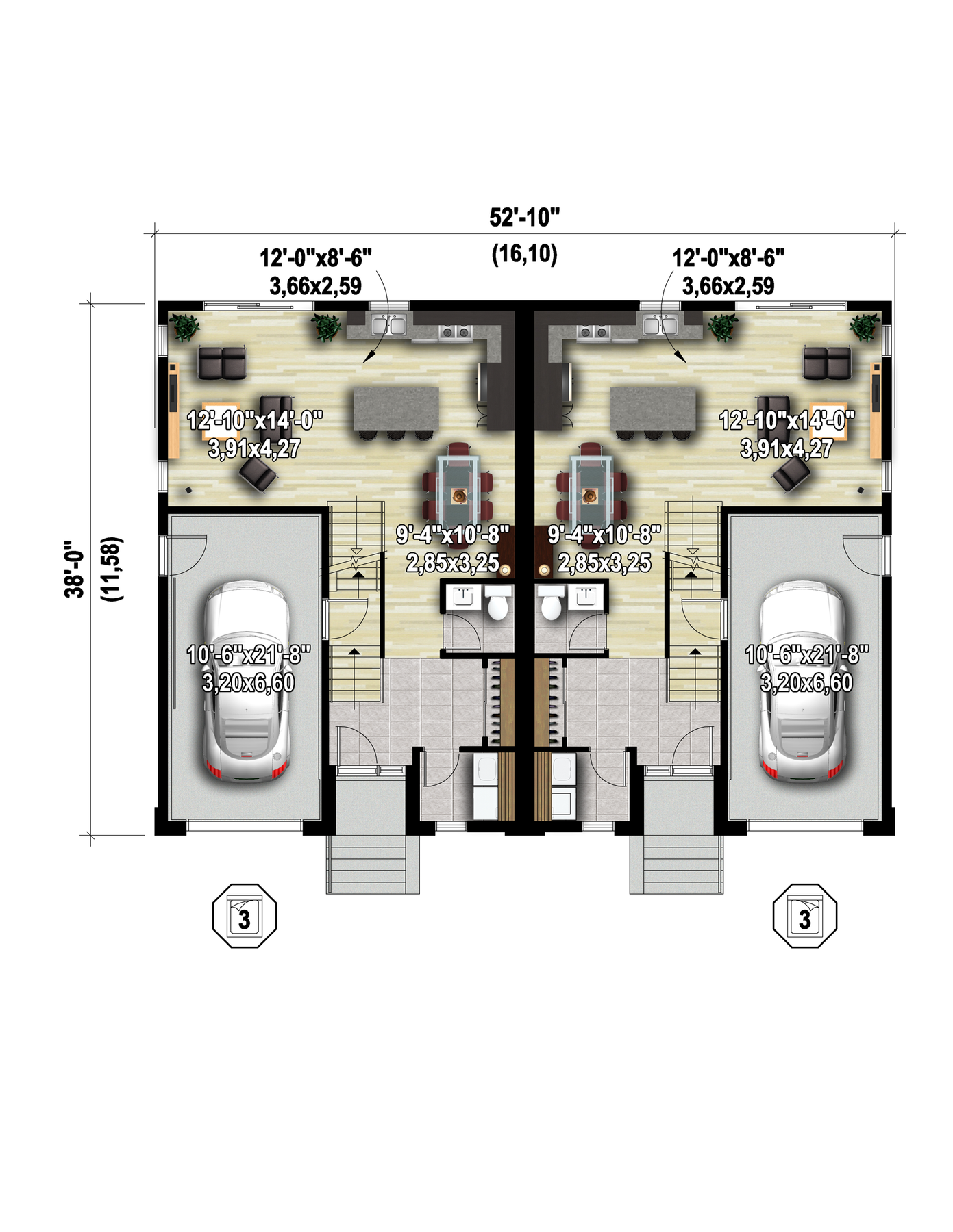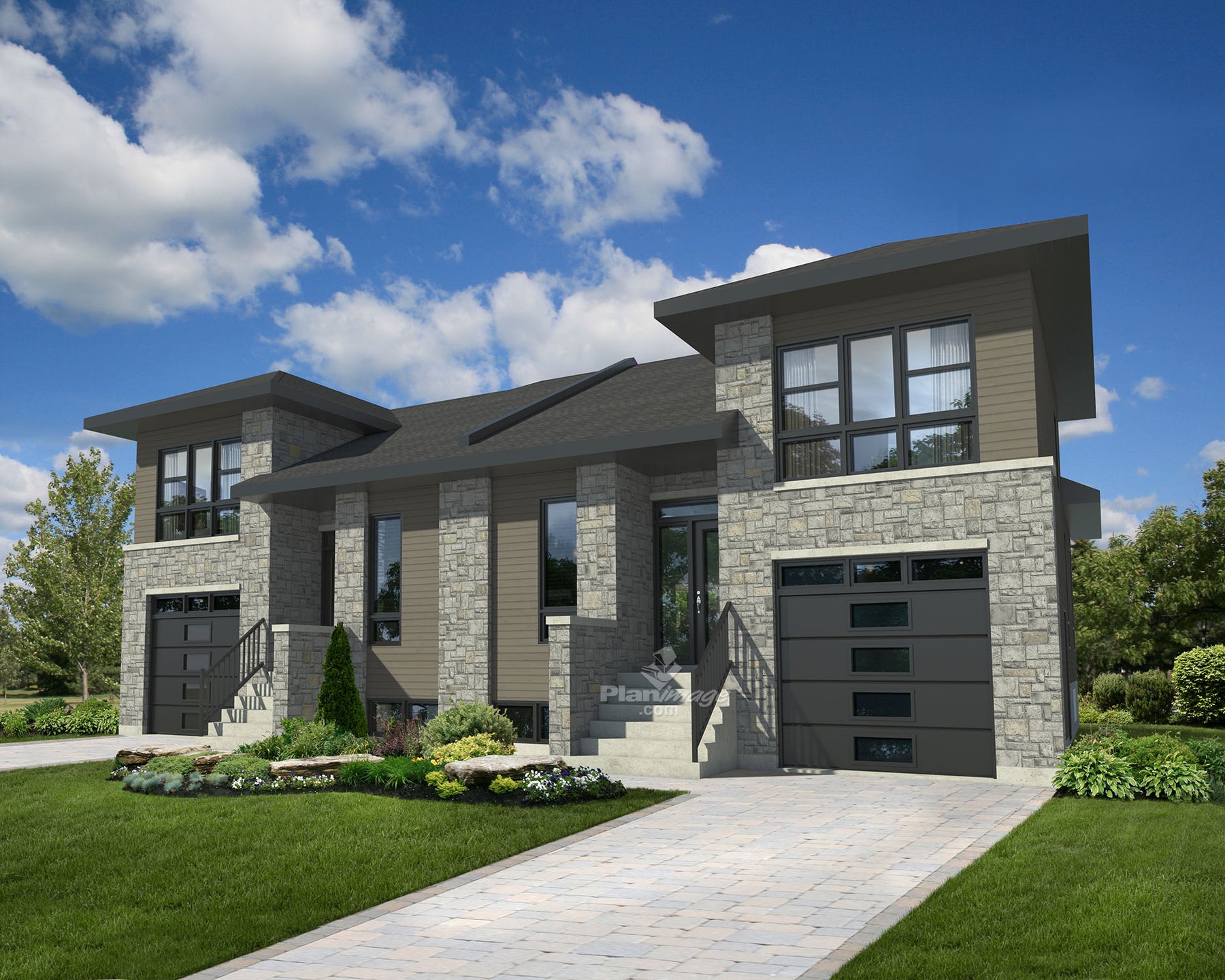 These semi-detached split-level houses have an aluminum, stone and wood facade that enhances their elegant style. Together, the two houses are 52 feet 10 inches wide by 38 feet deep, and provide a total living area of ​​3,404 square feet – which is 1,702 square feet per home – including two one-car garages of 270 square feet each.