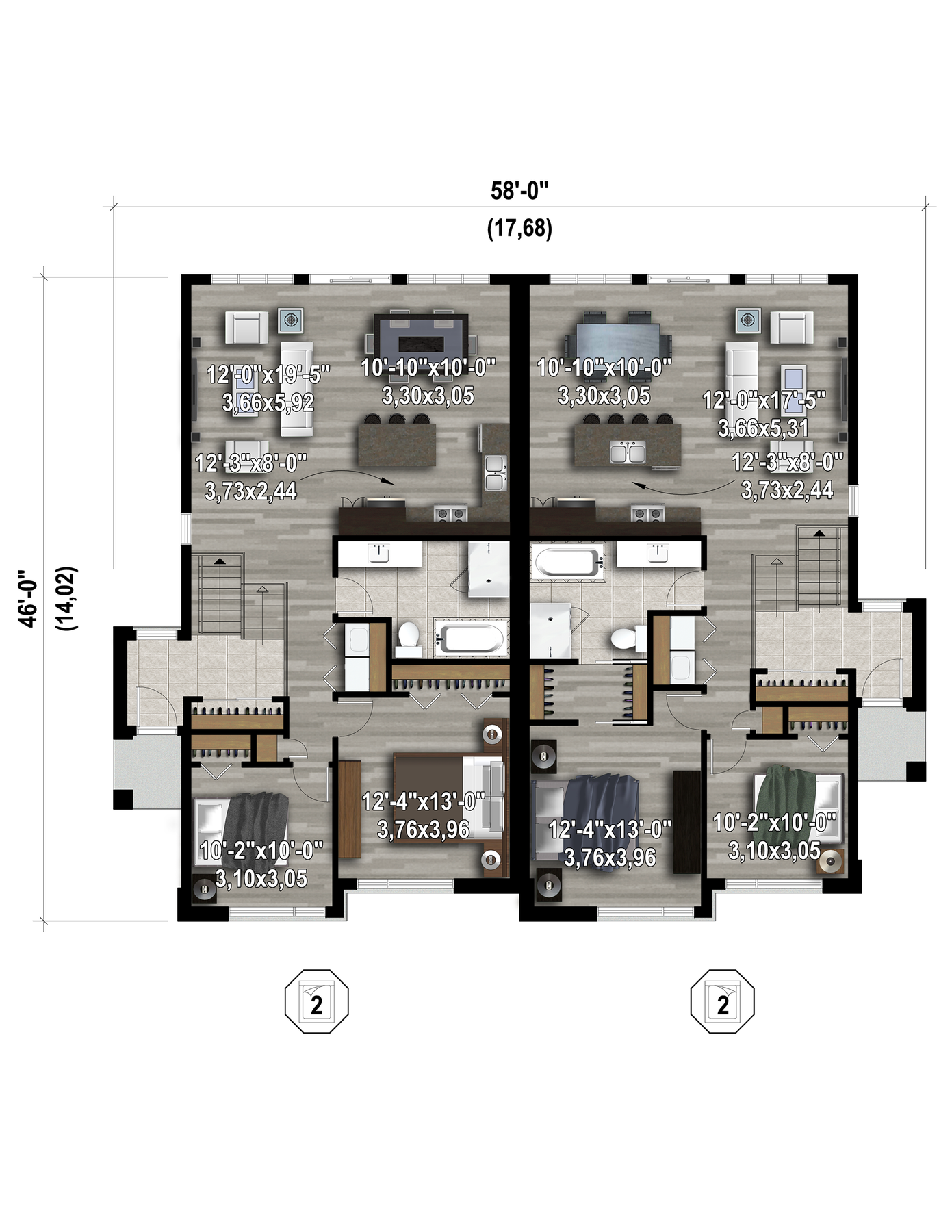 These two lovely semi-detached houses stand out with their modern architecture. Together, they are 58 feet wide by 46 feet deep and provide a total of 2,246 square feet of living space.