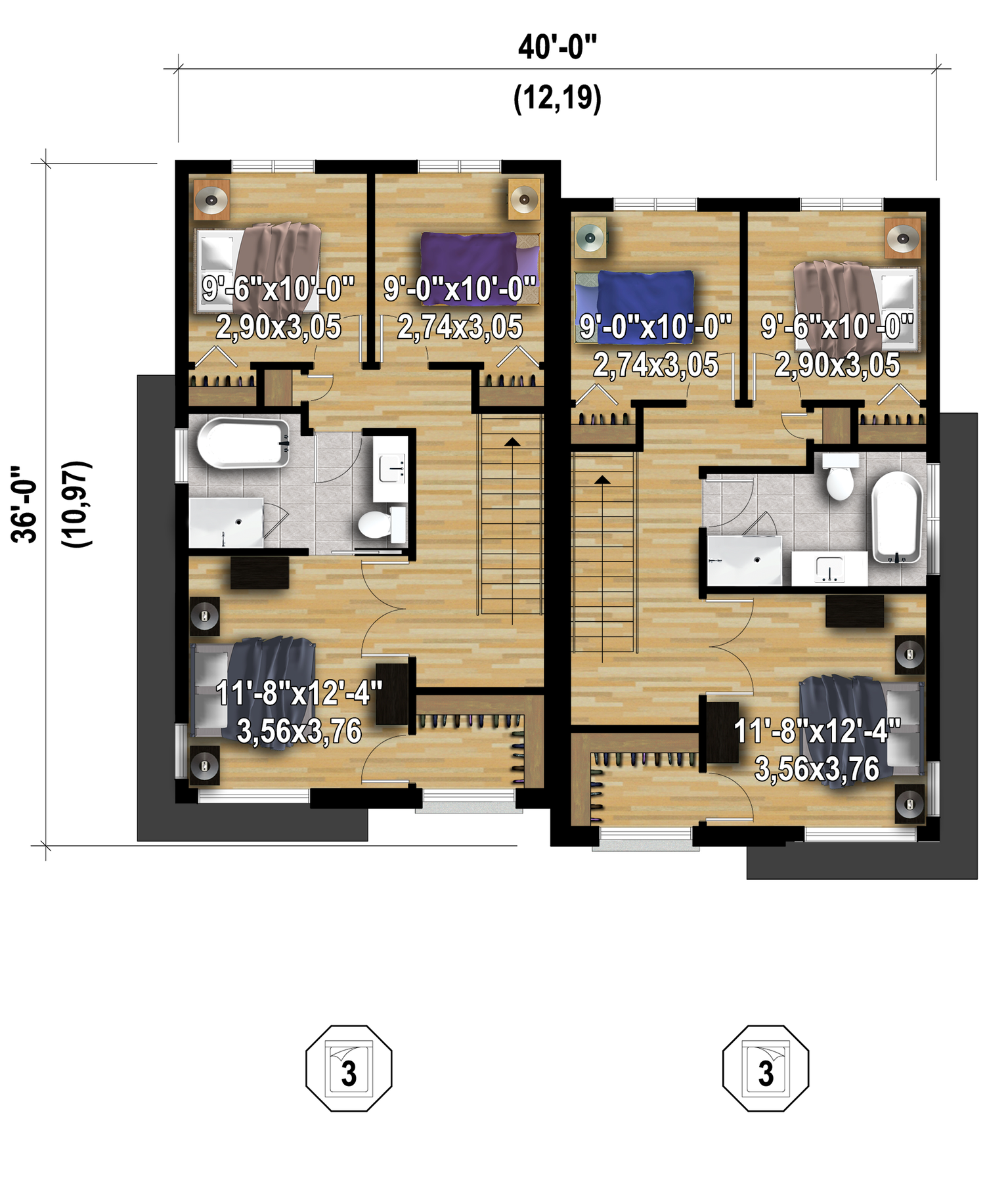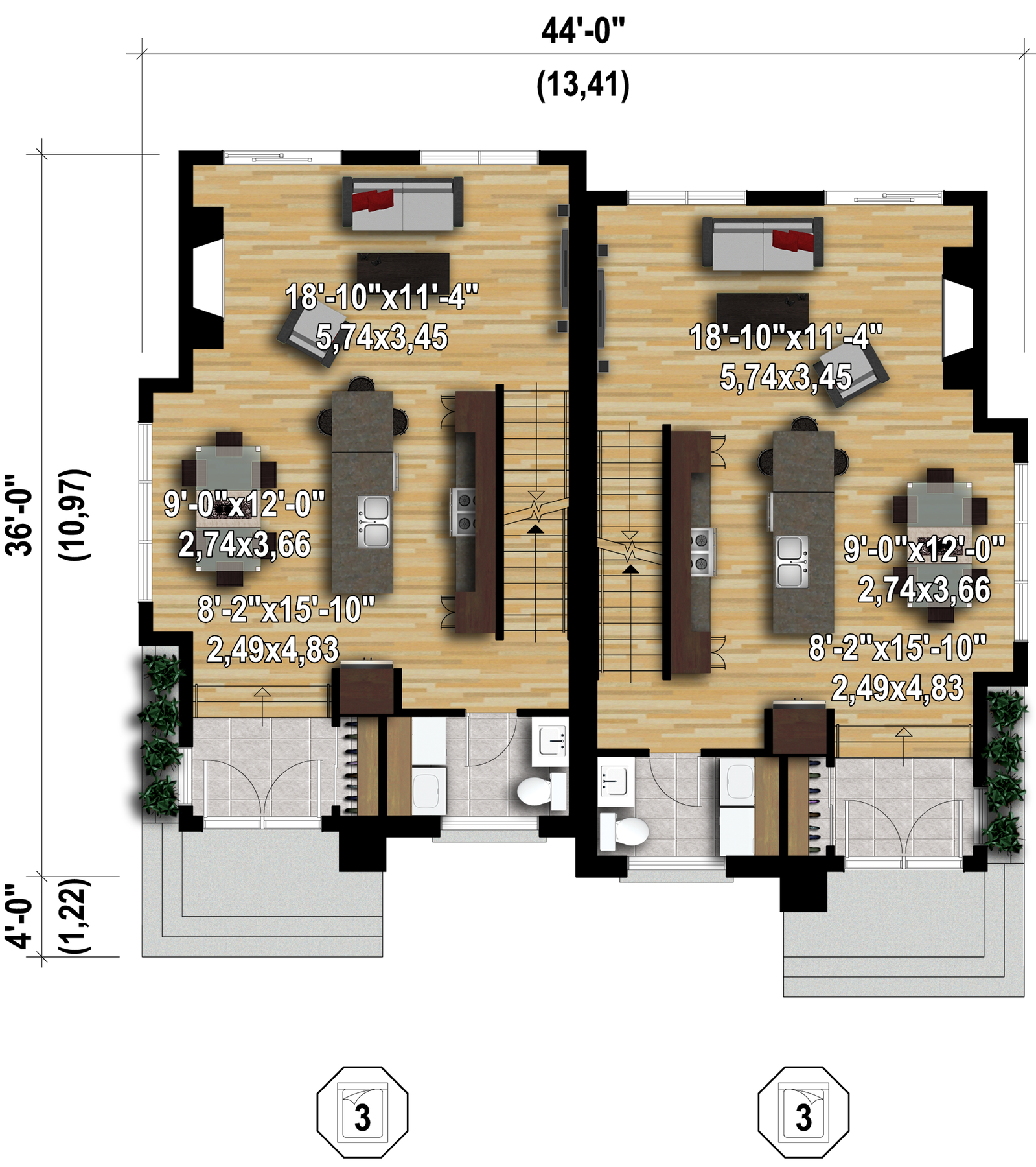 Together, these semi-detached modern cottages are 44 feet wide by 36 feet deep and provide a total of 2,824 square feet of living space. The living area is the same in each home, which is 1,412 square feet, and the room layout is more or less identical.