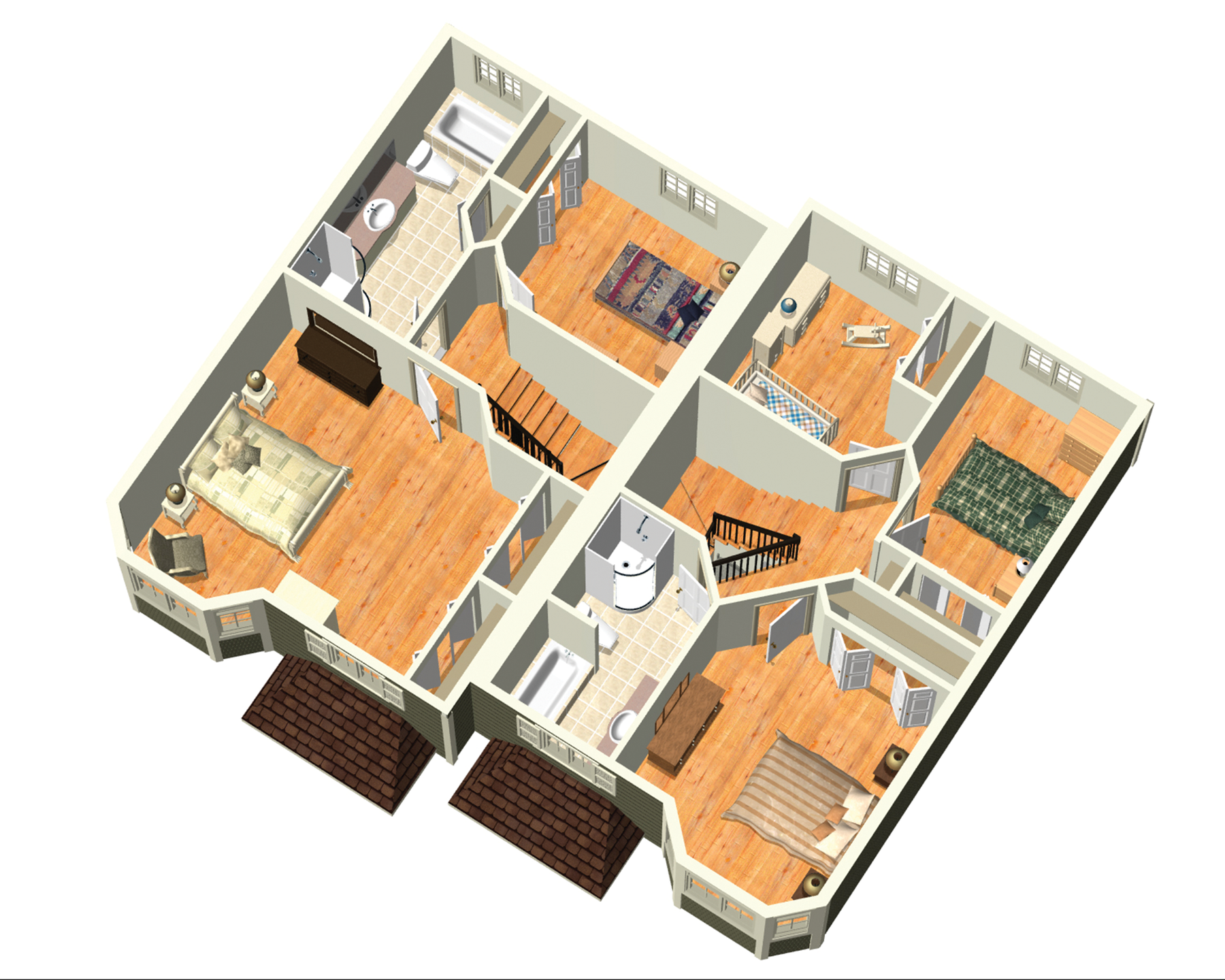 The upper floor of the right house includes a bathroom and three bedrooms, which is ideal for bigger families.