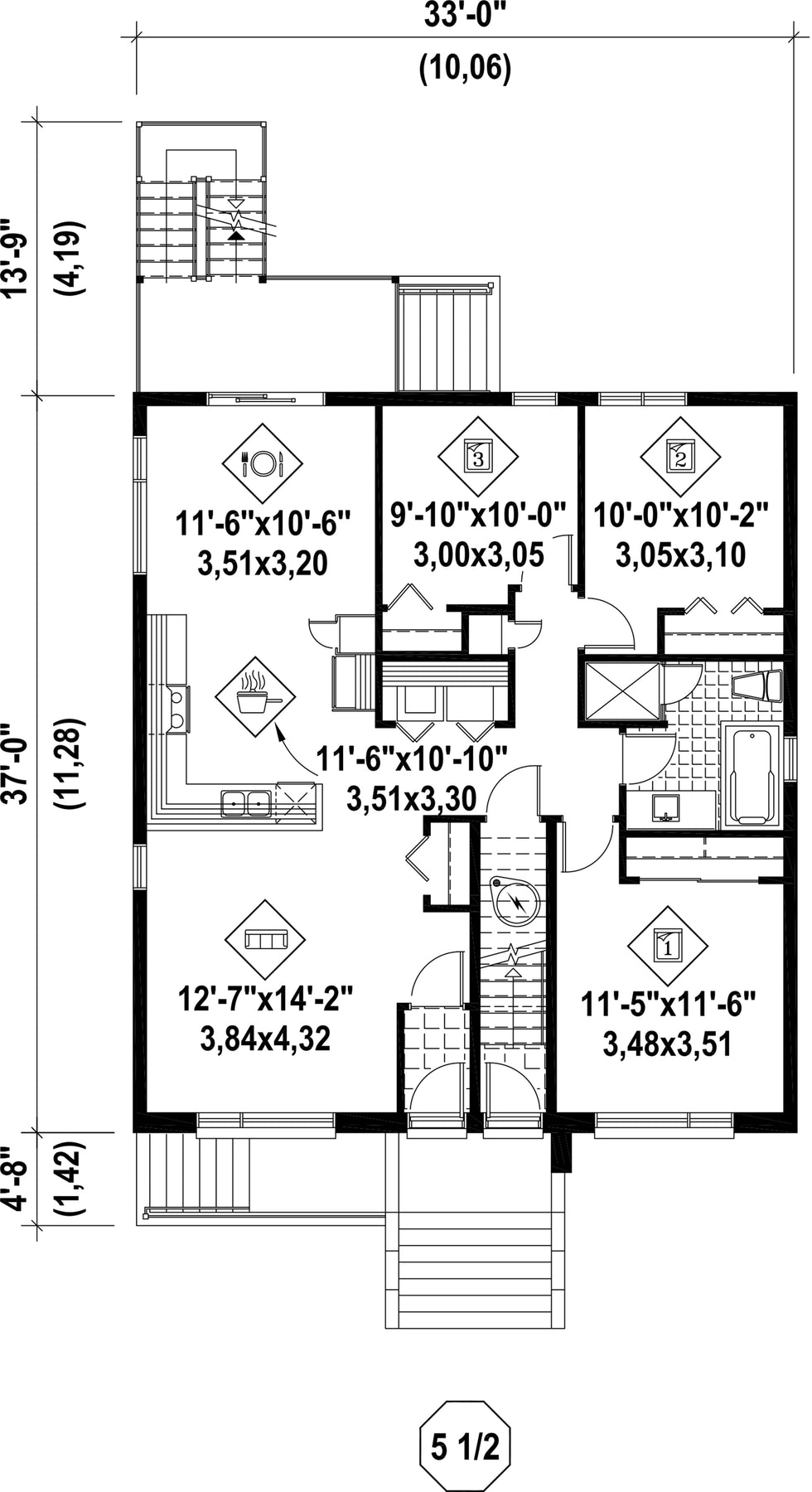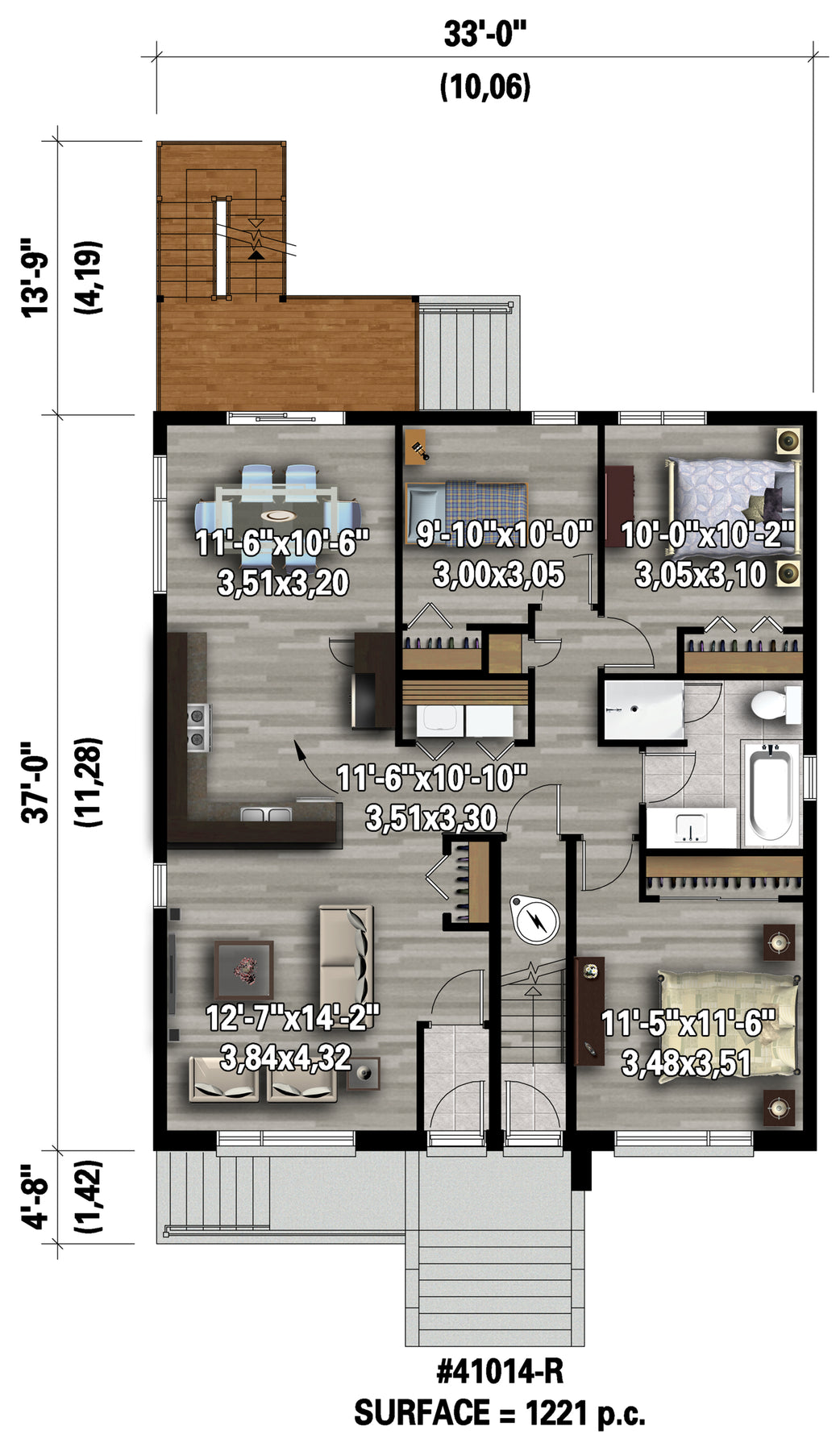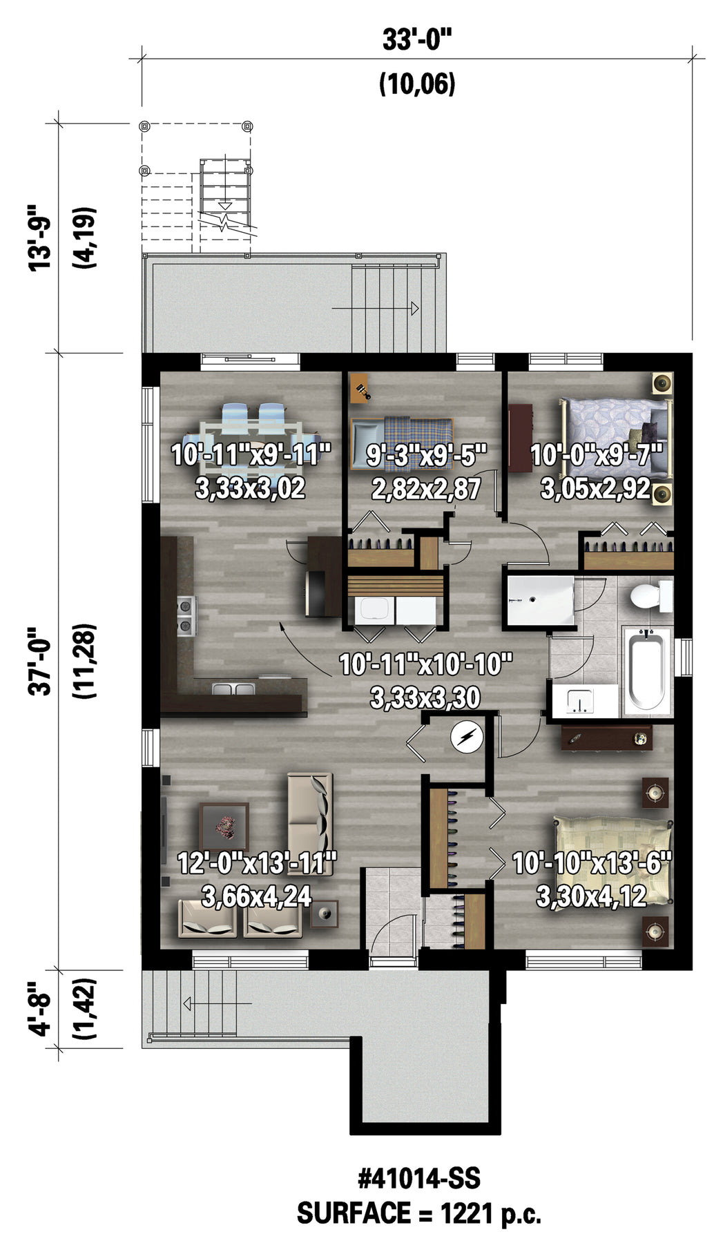 This contemporary triplex includes three 5 ½ room units, each with its own private entrance, and features a total of 3,663 square feet of living space. Each unit has a 1,221 square-foot living area. The room layout is identical in all three units.