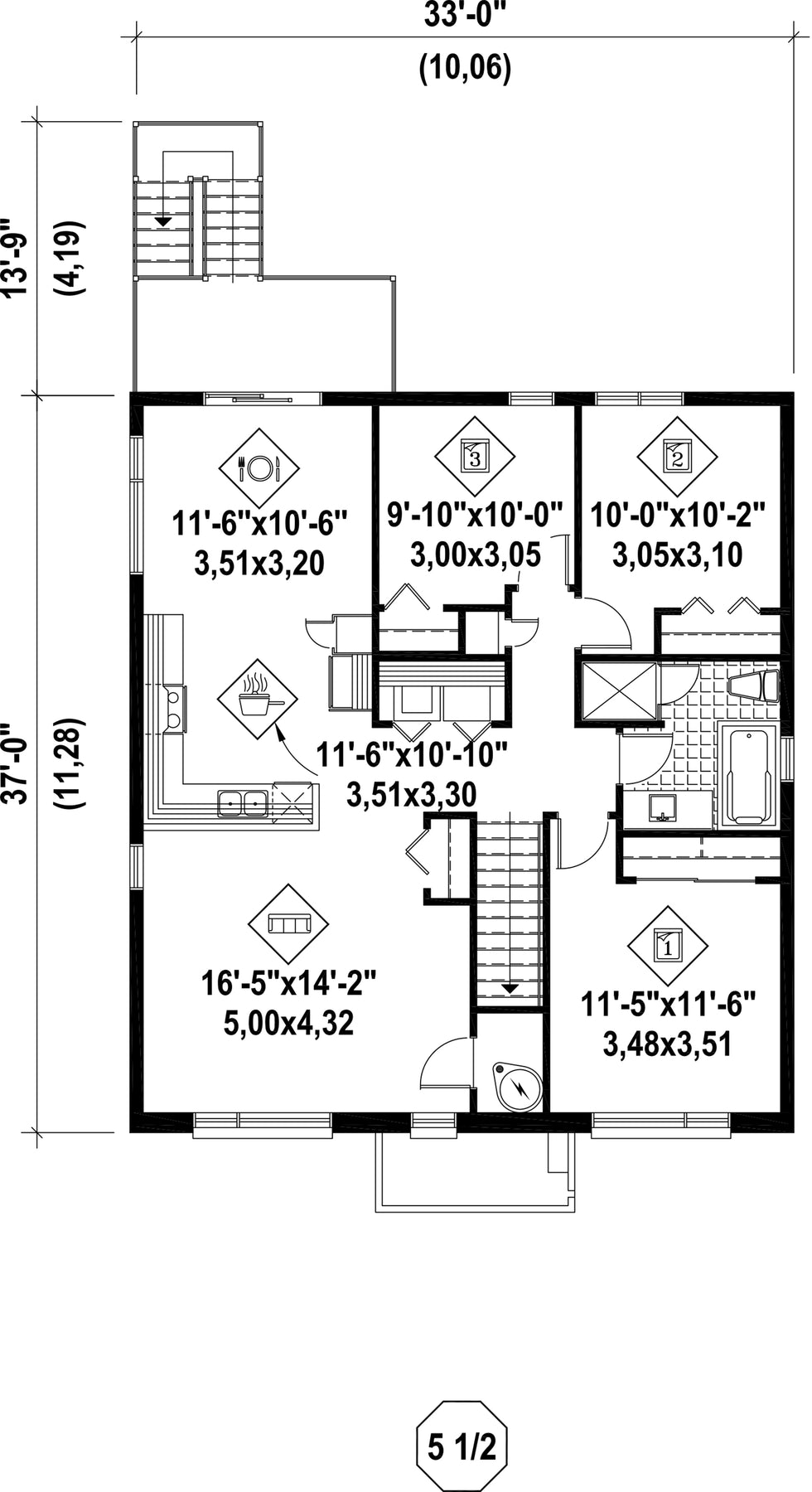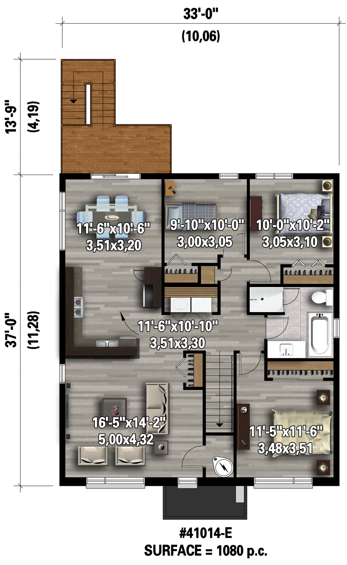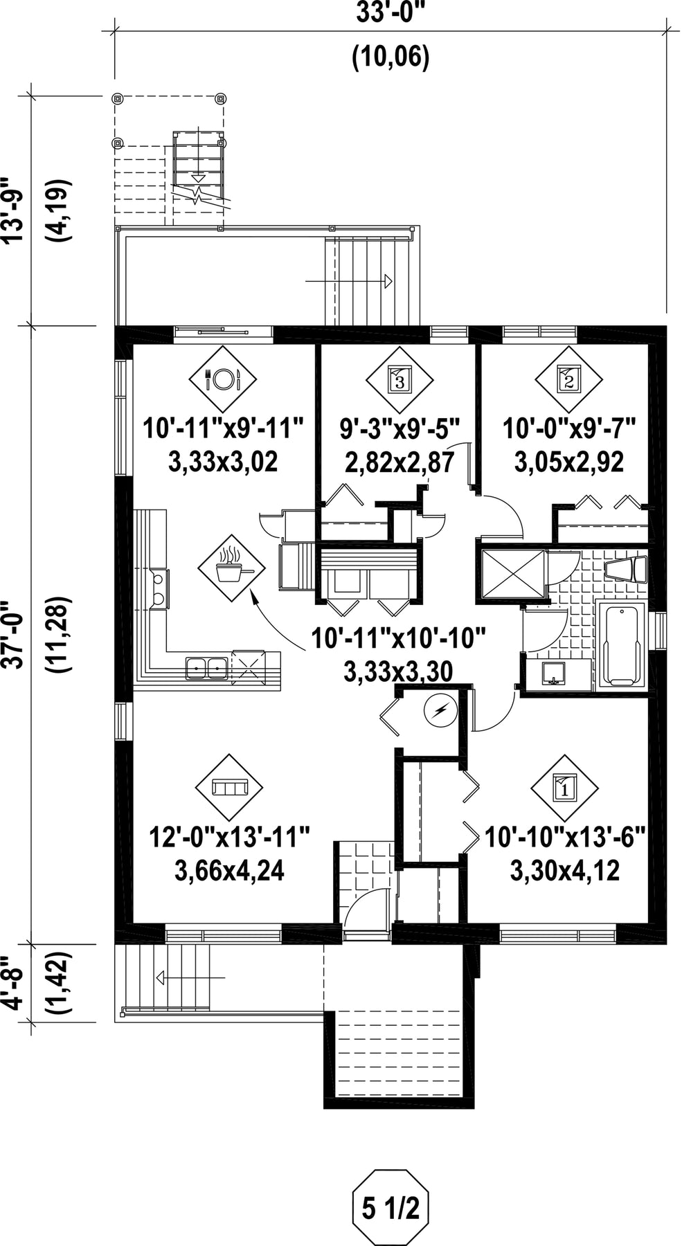 This contemporary triplex includes three 5 ½ room units, each with its own private entrance, and features a total of 3,663 square feet of living space. Each unit has a 1,221 square-foot living area. The room layout is identical in all three units.
