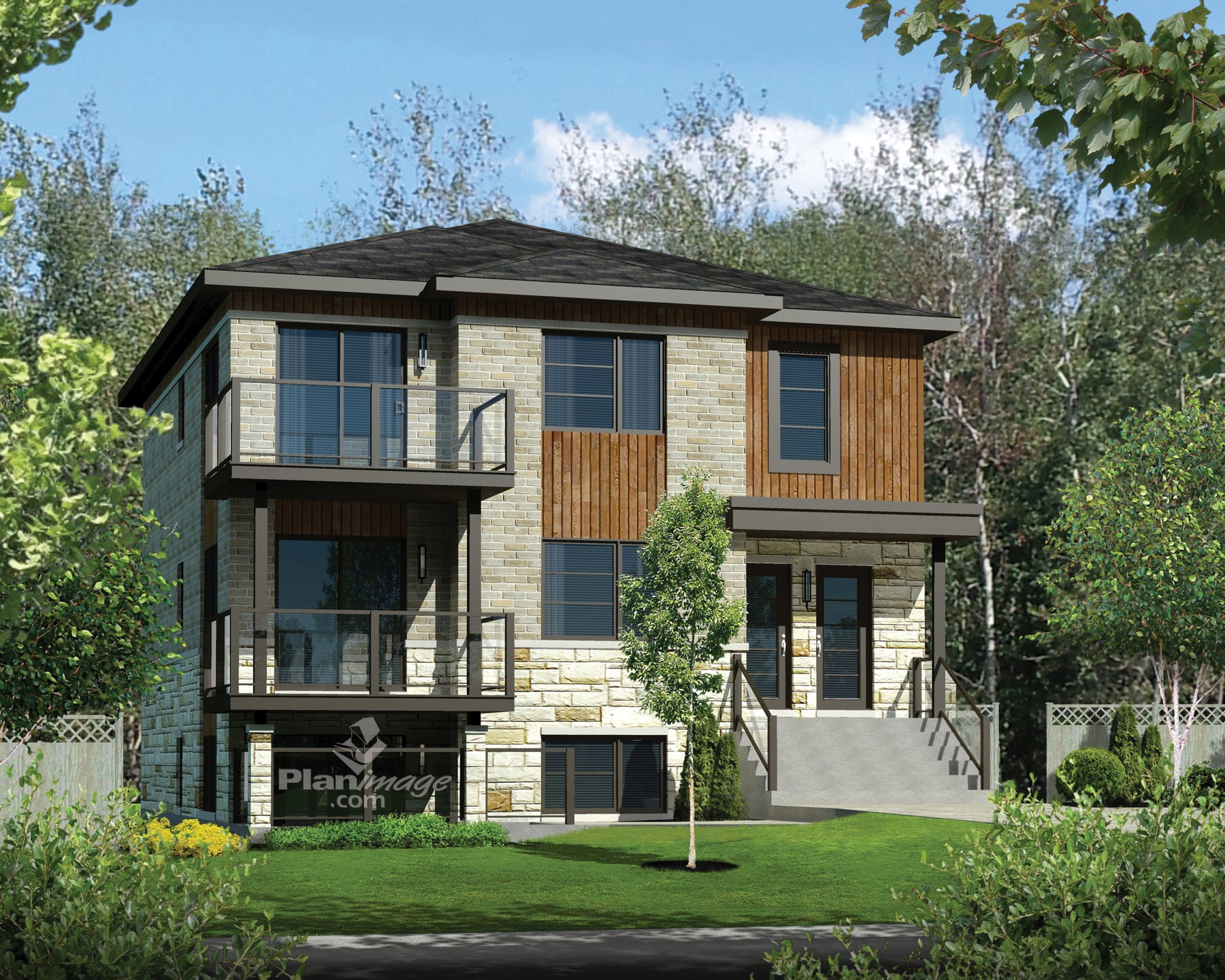 This stone, brick and wood triplex includes three apartments of four and a half rooms, and provides a total of 3,534 square feet of living space. Each unit has a back exit, a balcony with a glass railing and a storage area, and includes a kitchen with a lunch counter, two bedrooms, a living room, a dining room, a laundry area, as well as a bathroom with a podium bathtub and a separate shower.