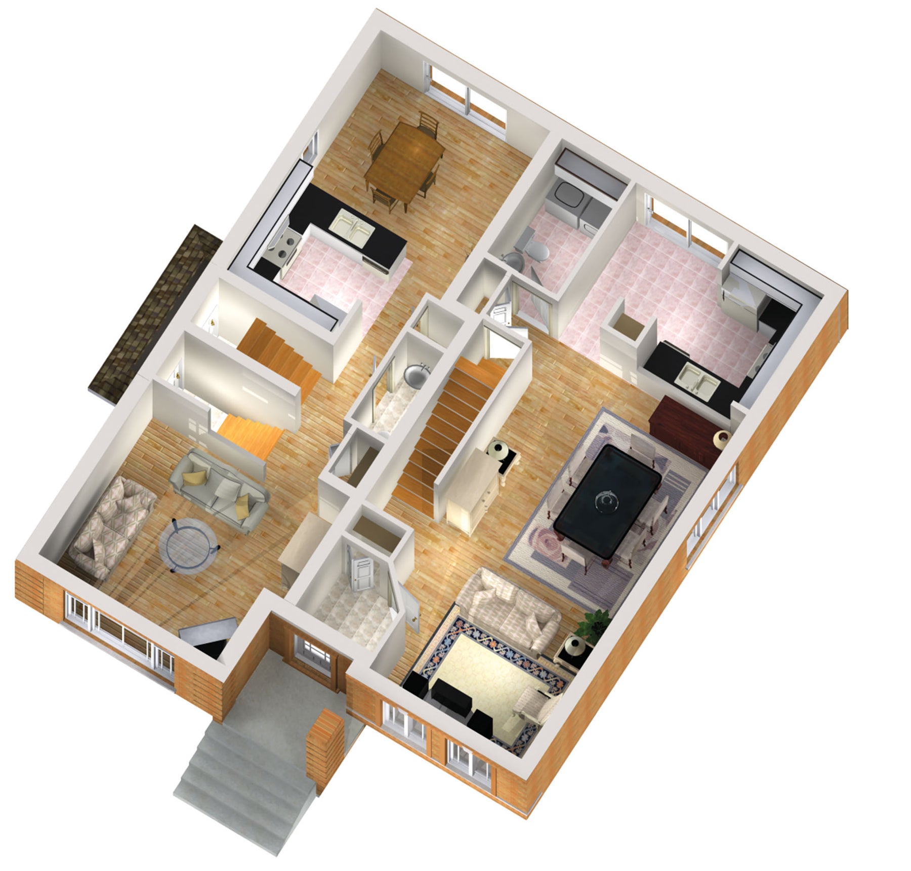 The basement unit includes a bathroom with a laundry area, a U-shaped kitchen, a living room, a dining room, and two bedrooms. The other two units are located on the ground and upper floors. The right unit is bigger than the left one.