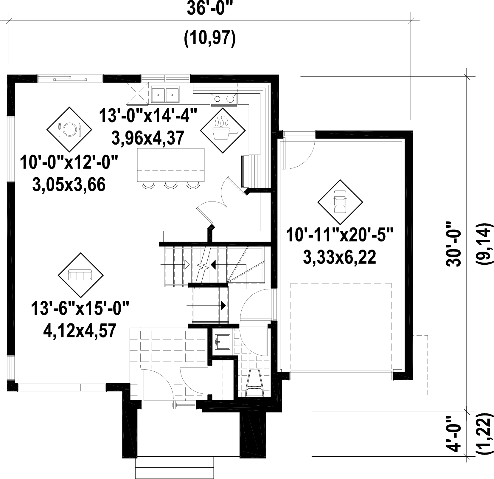 The 701 square foot open concept main floor includes a bathroom, a living room, a dining room and a kitchen with an island that can accommodate three people.