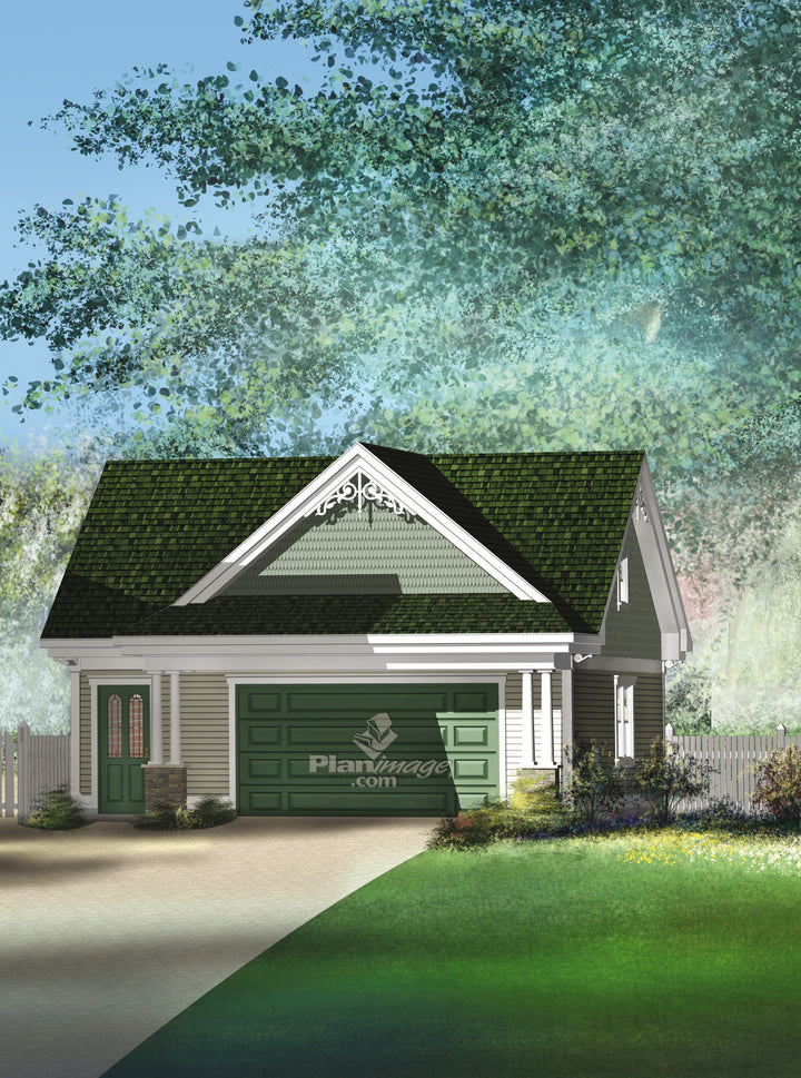 With its decorative details, its fish scale facing and columns, this magnificent two-car garage will truly enhance your property. In addition to parking your cars, you’ll have enough room to set up a workshop. It has a window on the left side, and two windows on the right side, one of which is false. This garage is most practical with two service doors, one in the front and the other in the back, that allow the owners to go in and out quickly.