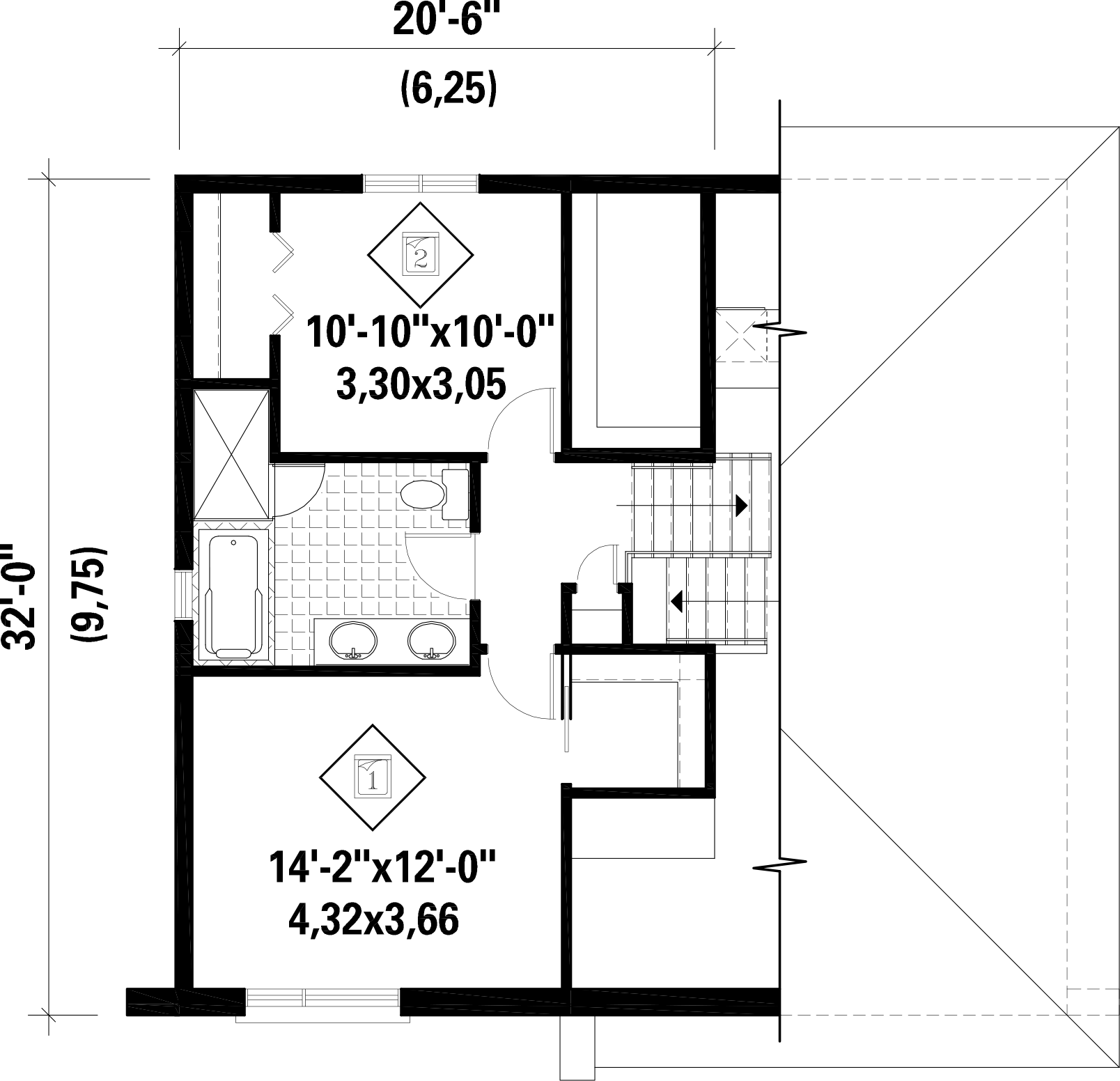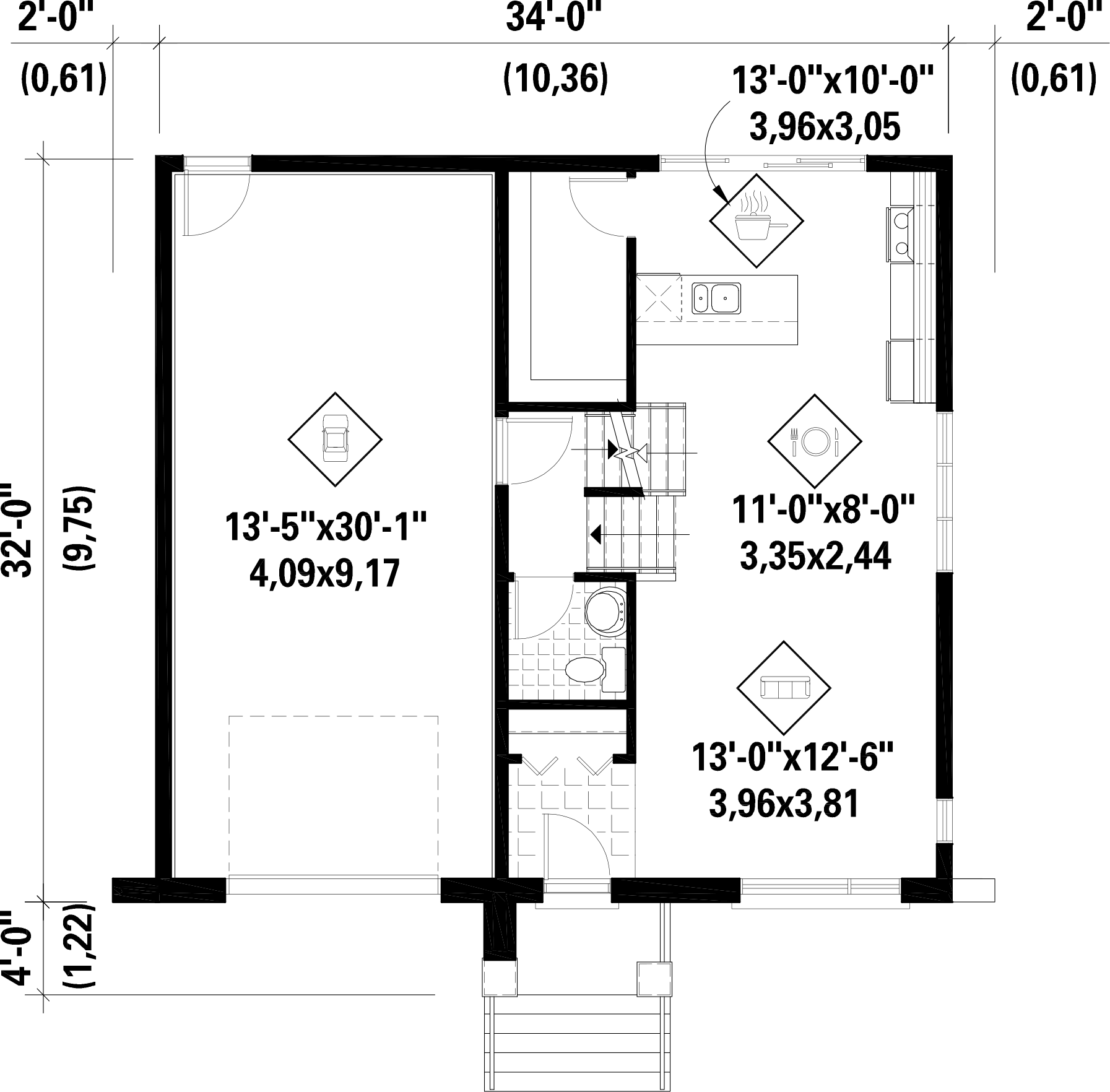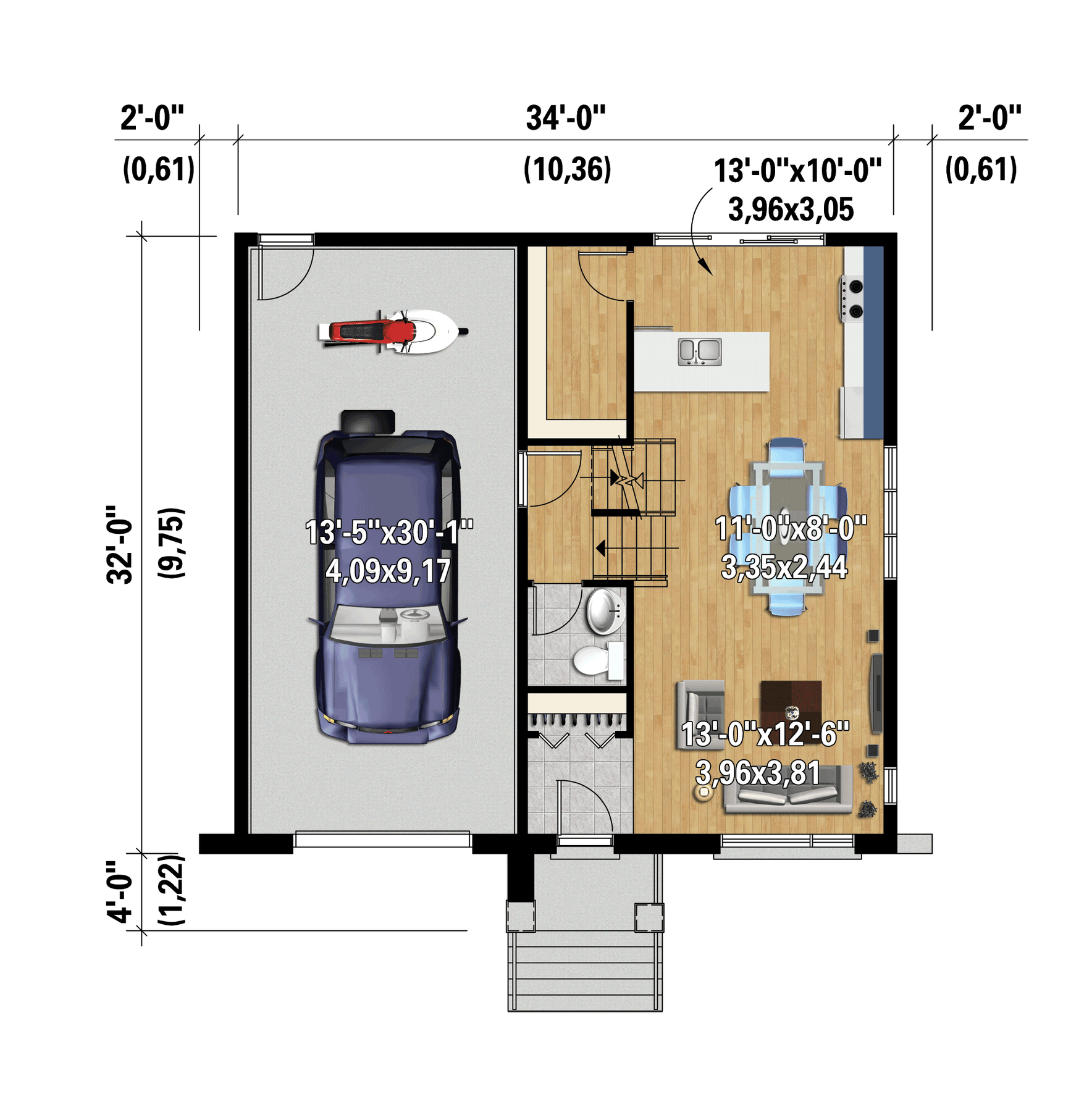 The architectural details and the stone, aluminum and wood facing of this split-level house give it a distinctly chic and urban look. This home is 34 feet wide by 32 feet deep and features 1,154 square feet of living space in addition to a 464 square foot one-car garage.