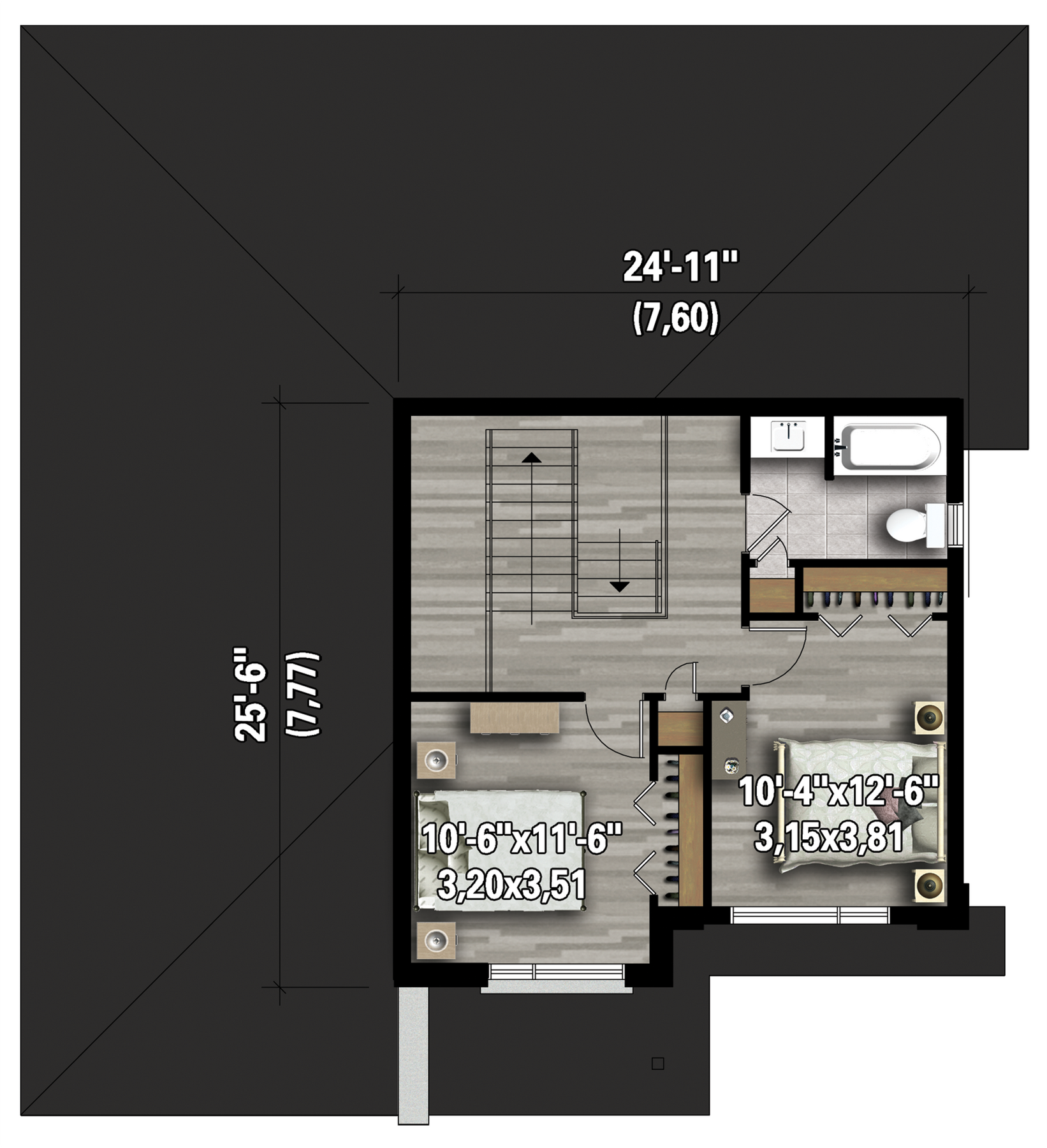 The upper floor has a 476 square-foot living area that includes a family bathroom and two bedrooms.