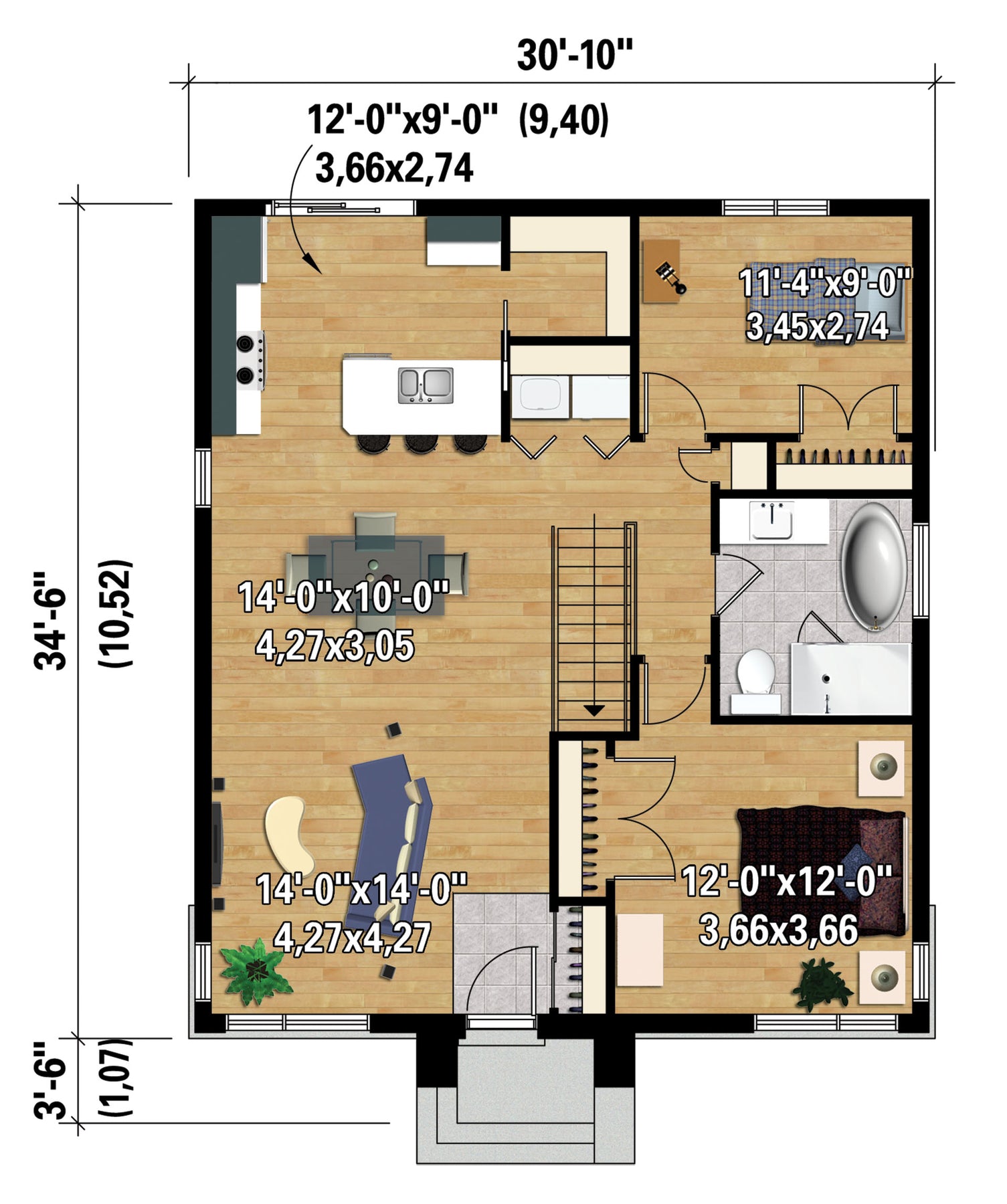 | Front | 30 ft 10 in | Total living surface | 1035 ft² |