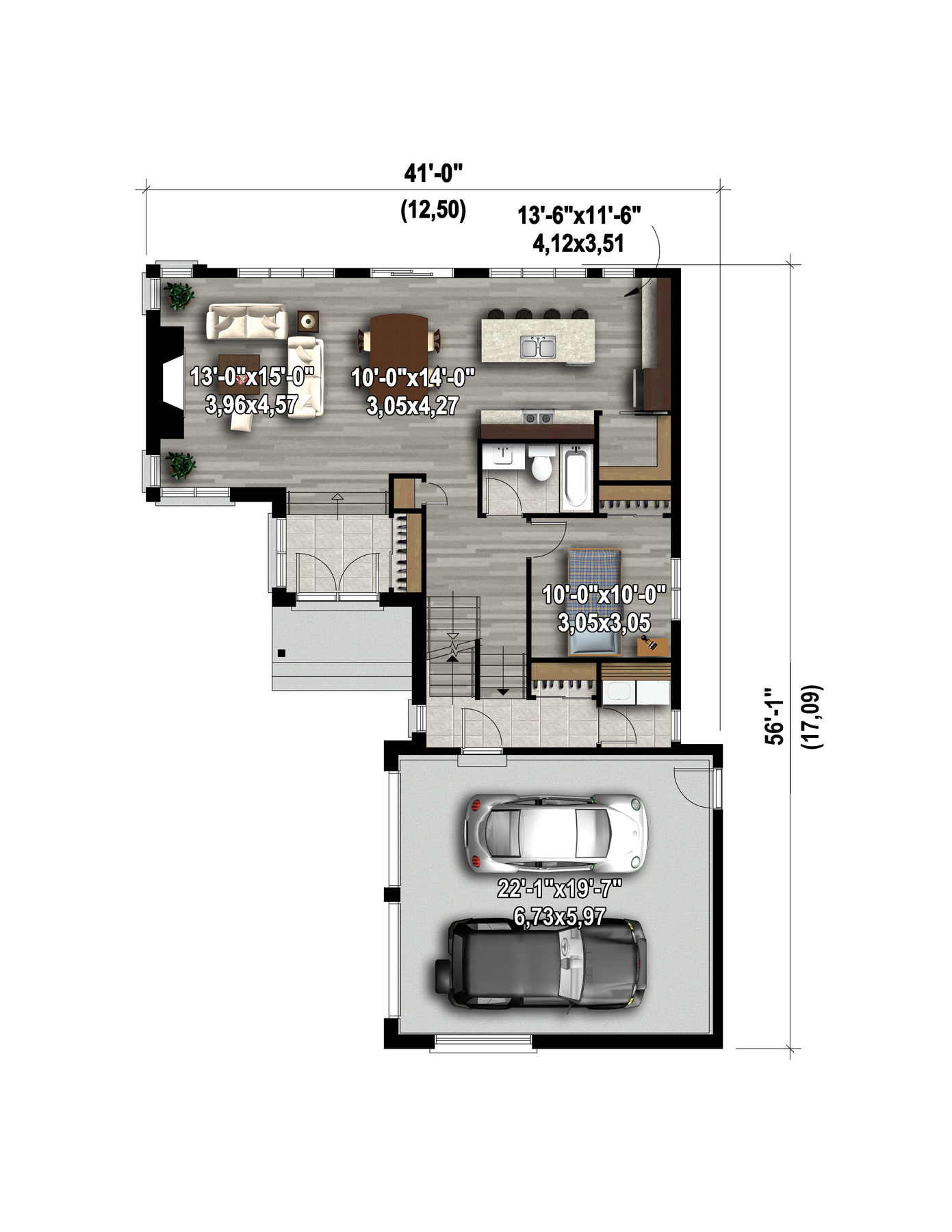 Thanks to several large windows, this stone and wood split-level will be very bright. The house is 41 feet wide by 56 feet deep, has a 1,720 square-foot living area, and features a side entrance and a 508 square-foot two-car garage.