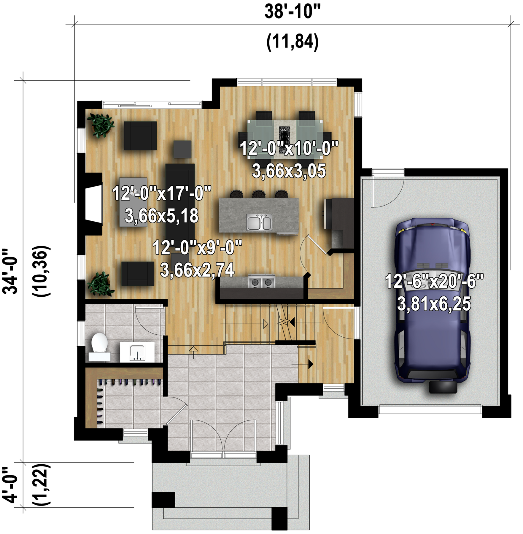 The beauty of this ultra-modern two-storey house is brought out by the abundant windows, the large porch and by the stone, brick and wood facing. The house is 38 feet 10 inches wide by 34 feet deep and provides 1,839 square feet of living space along with a 289 square-foot one-car garage.
