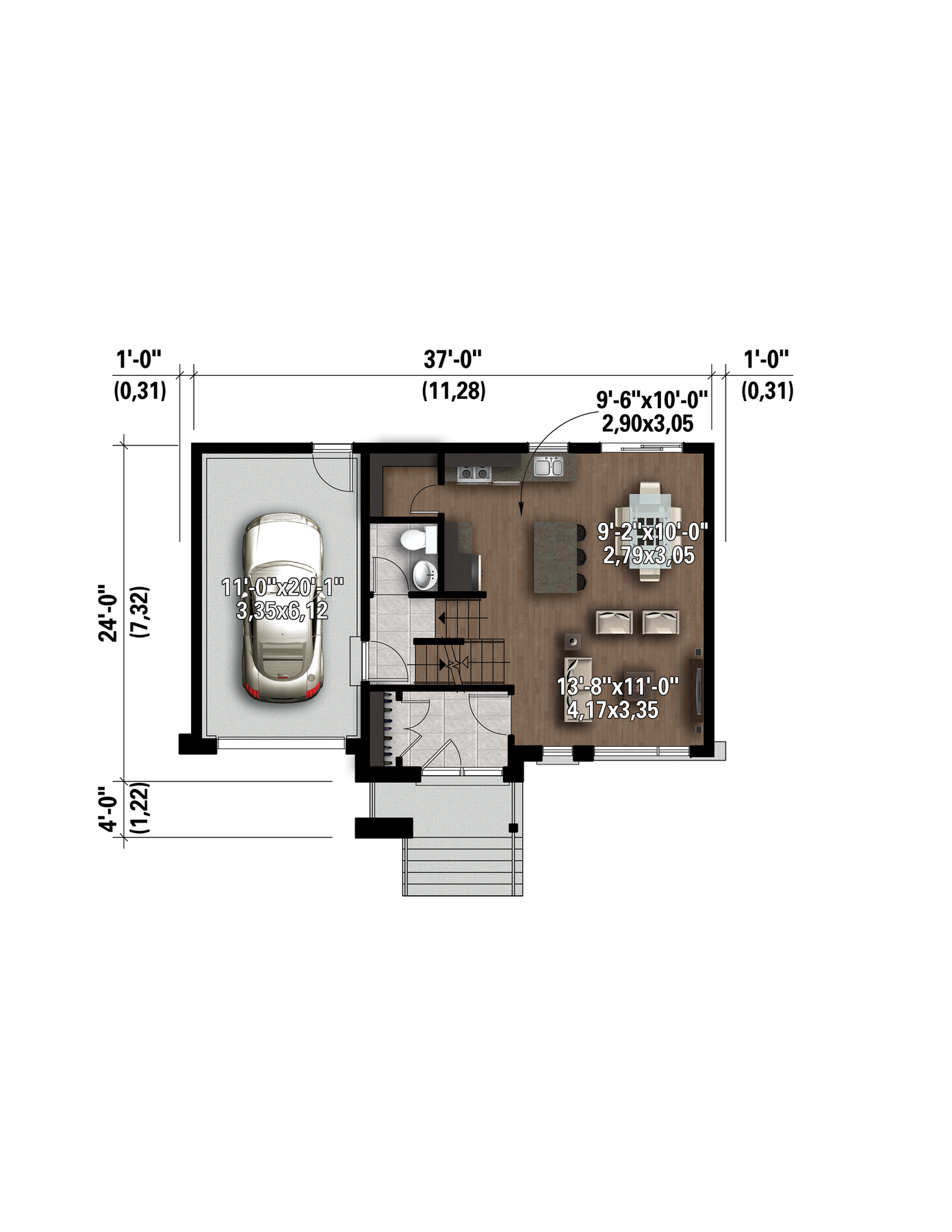 Refined and elegant, this relatively small two-storey house stands out with its large windows and the noble materials of its facade – brick, wood and stone. The home is 37 feet wide by 24 feet deep and has 1,426 square feet of living space, in addition to a 264 square-foot one-car garage.