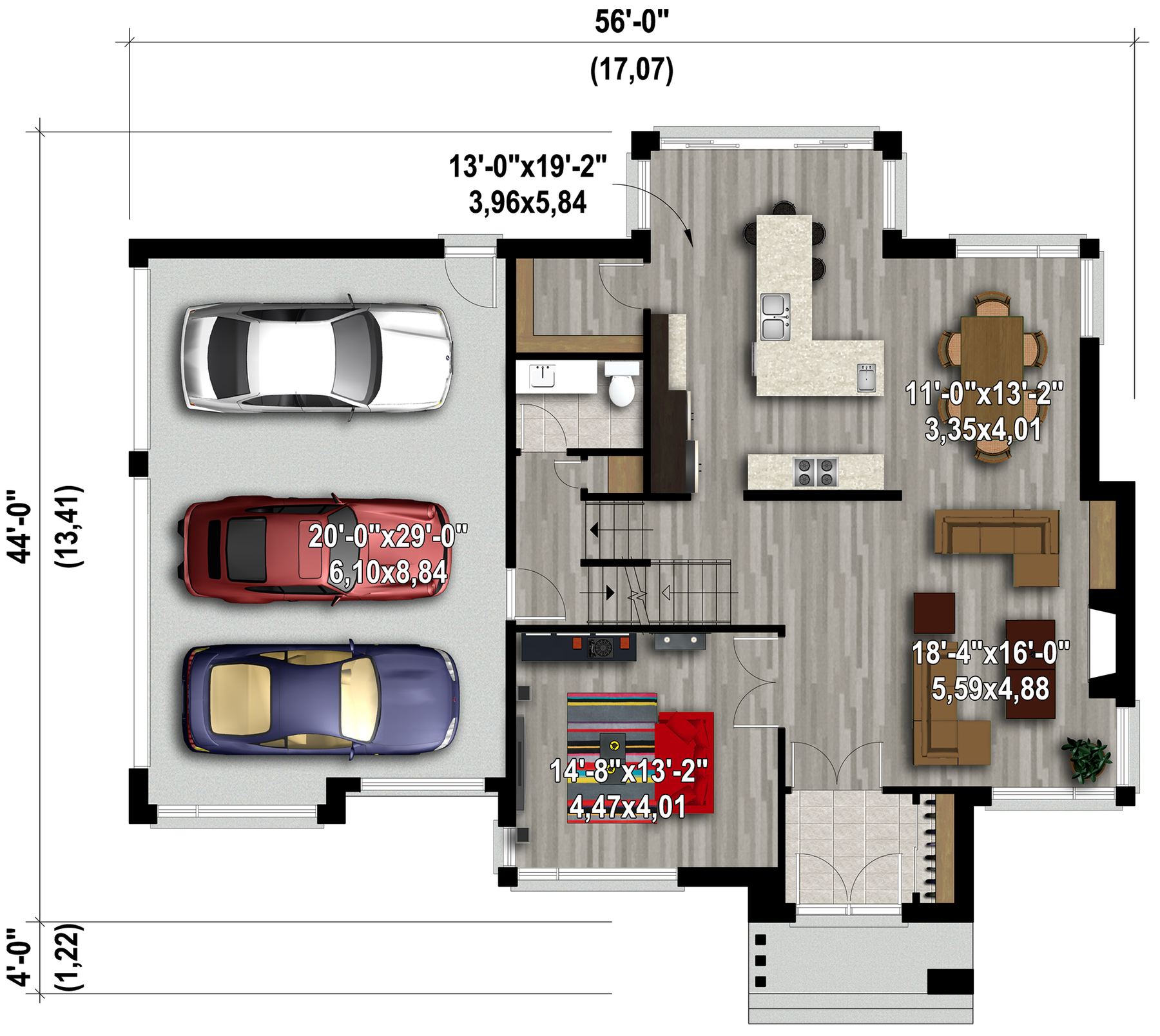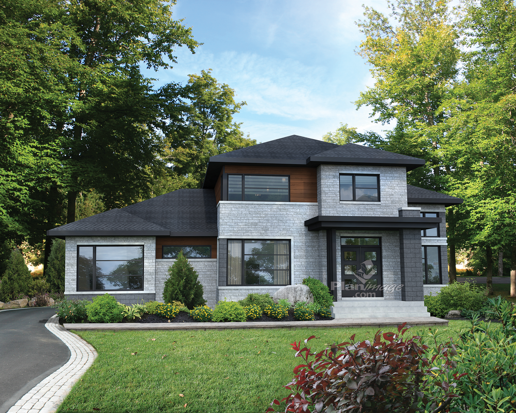 This striking urban two-storey house features extra-large windows and a stone and wood siding indicative of its style. The house is 56 feet wide by 44 feet deep, and provides 2,309 square feet of living space in addition to a 669 square-foot three-car garage with doors on the side.