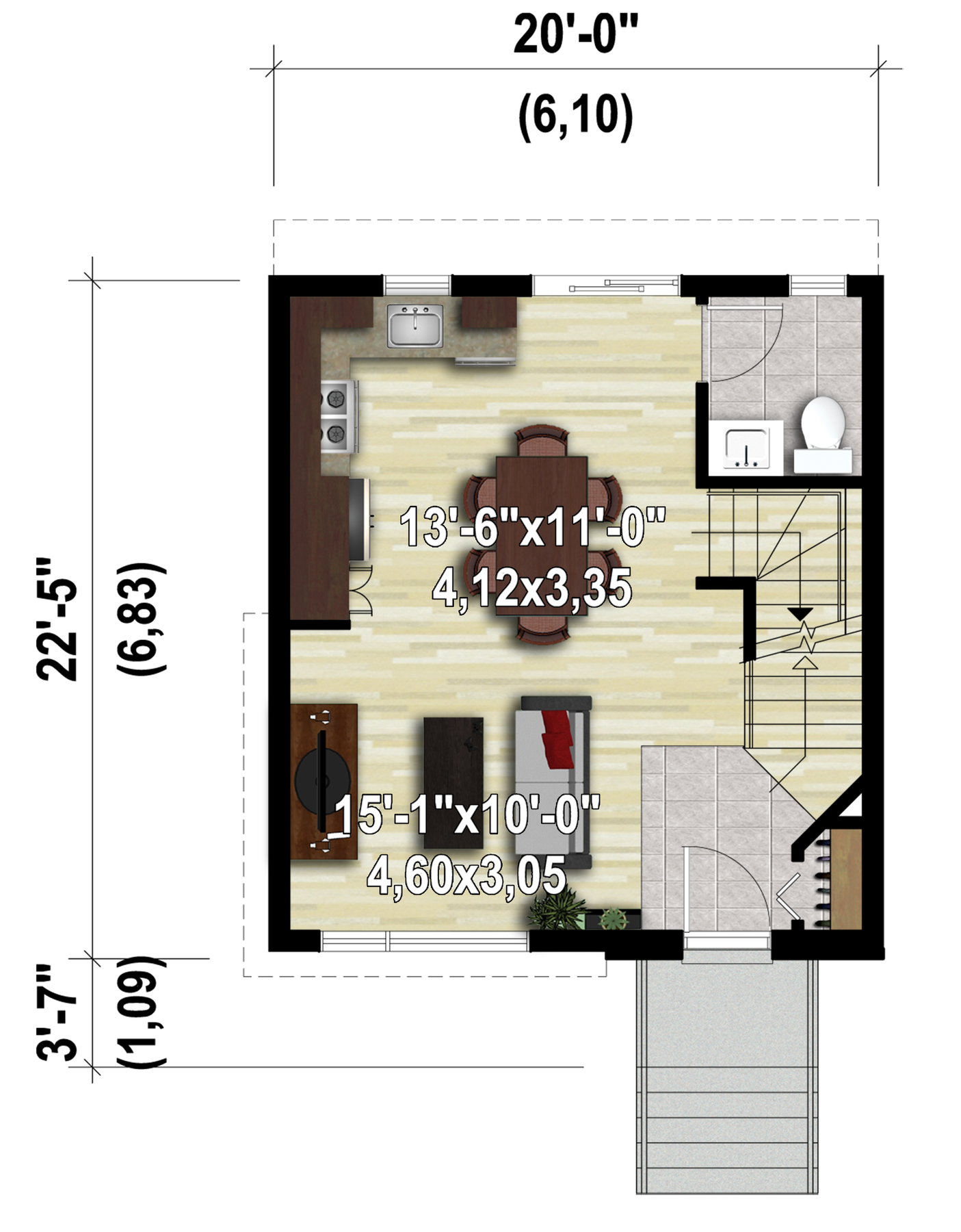 This urban two-storey house has an elegant facade of vertical and horizontal brick and aluminum siding. The compact house is 20 feet wide by 22 feet 5 inches deep and provides 947 square feet of living space. See plan #21545 for a different design option of the second storey.