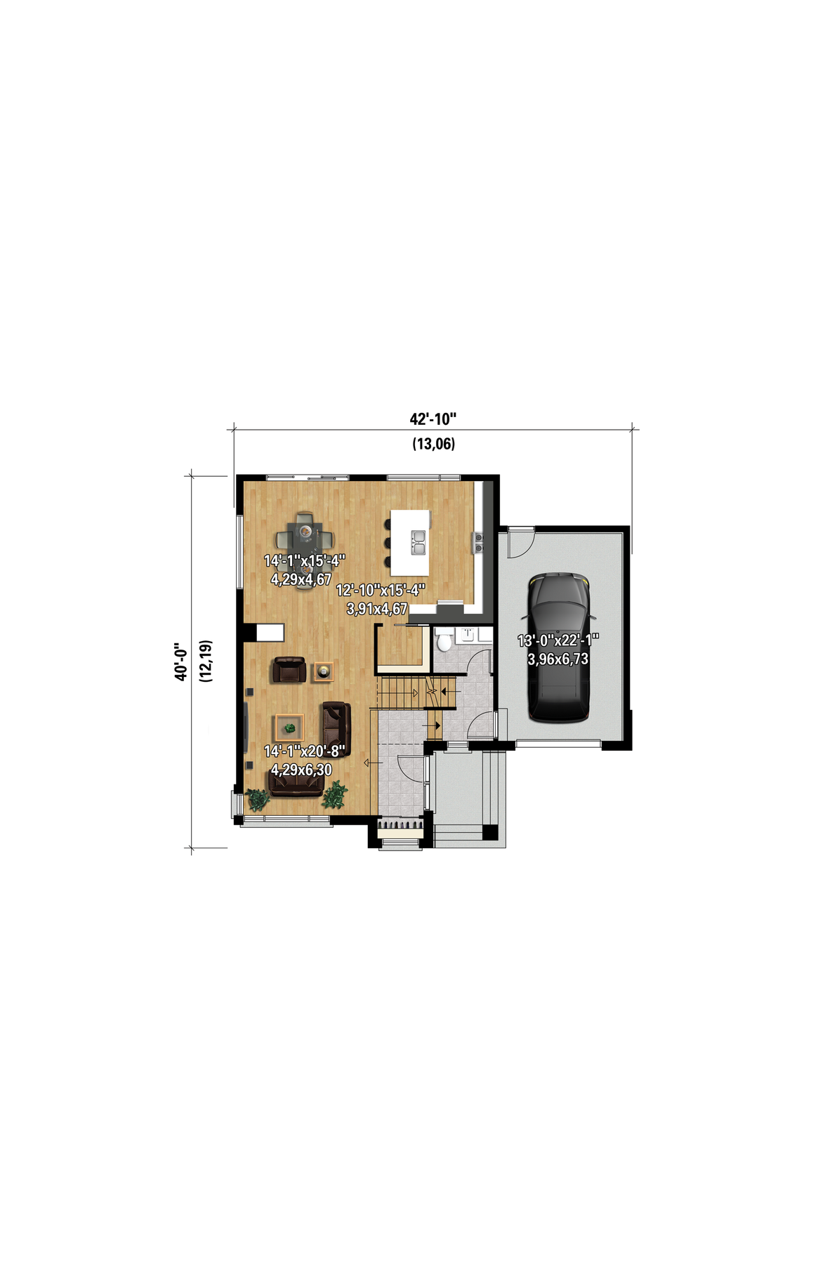 This urban two-storey house is definitely trendy with its well-proportioned combination of stone, brick and horizontal wood siding. The home is 42 feet 10 inches wide by 40 feet deep and provides 2,342 square feet of living space. There is also a 338 square-foot one-car garage with a service door overlooking the back of the house.