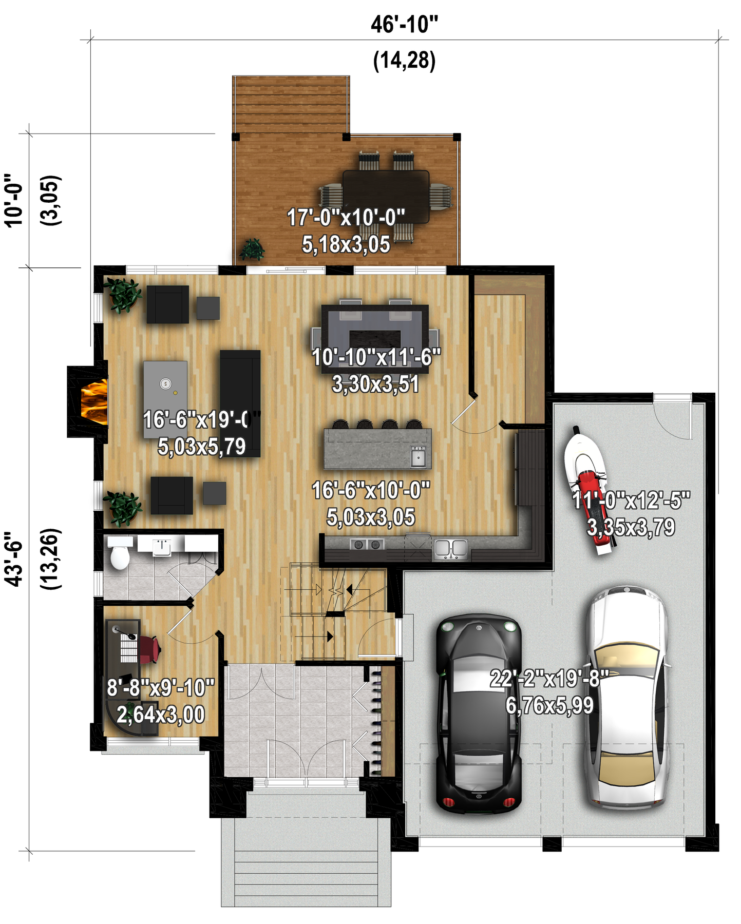 With its brick, stone and wood siding, this two-storey house truly reflects its positively modern style. The house is 46 feet 10 inches wide by 43 feet 6 inches deep, provides 2,423 square feet of living space, and has a covered terrace in the back along with a 646 square-foot two-car garage with a workshop area.