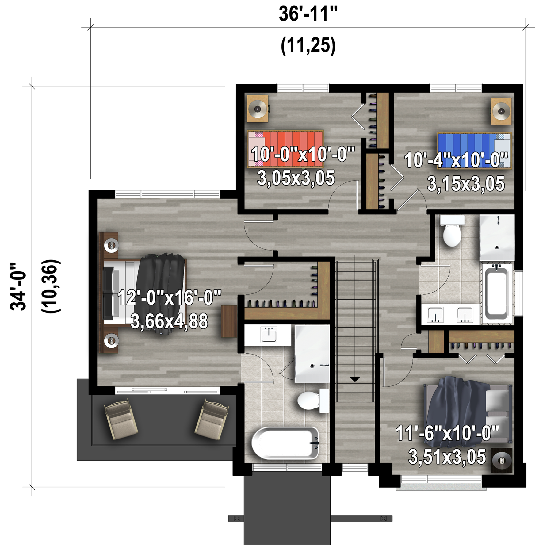 This breathtaking urban two-storey house with a private upper balcony is 37 feet 4 inches wide by 34 feet deep. It provides 1,824 square feet of living space in addition to a 276 square-foot one-car garage.