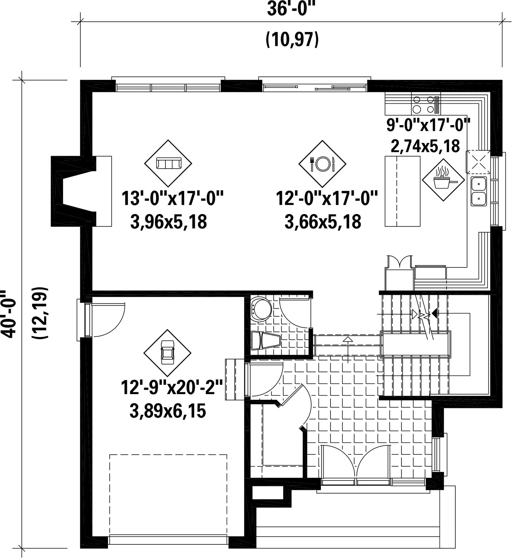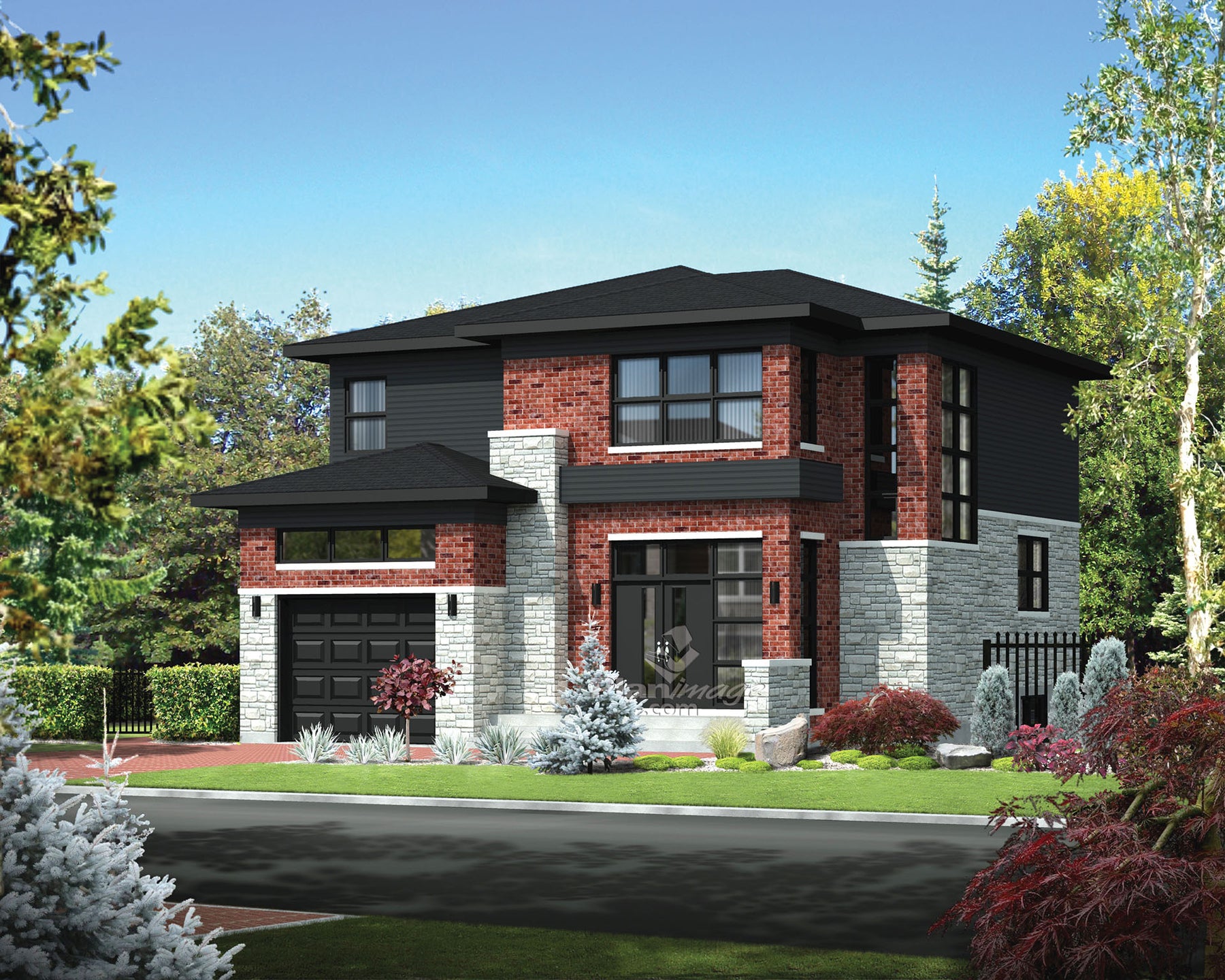 This contemporary two-storey house is 36 feet wide by 40 feet deep and provides 2,163 square feet of living space in addition to a 306 square foot one-car garage.