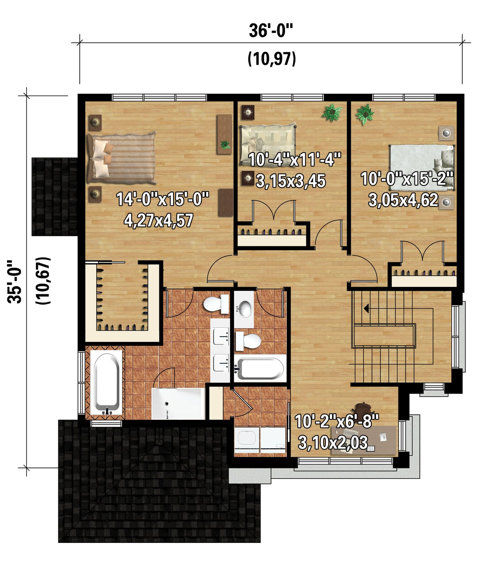 The upper floor has 1,169 square feet of living space and features a family bathroom, a laundry room, a reading area and three bedrooms, including a master bedroom with a large walk-in closet and a private bathroom.