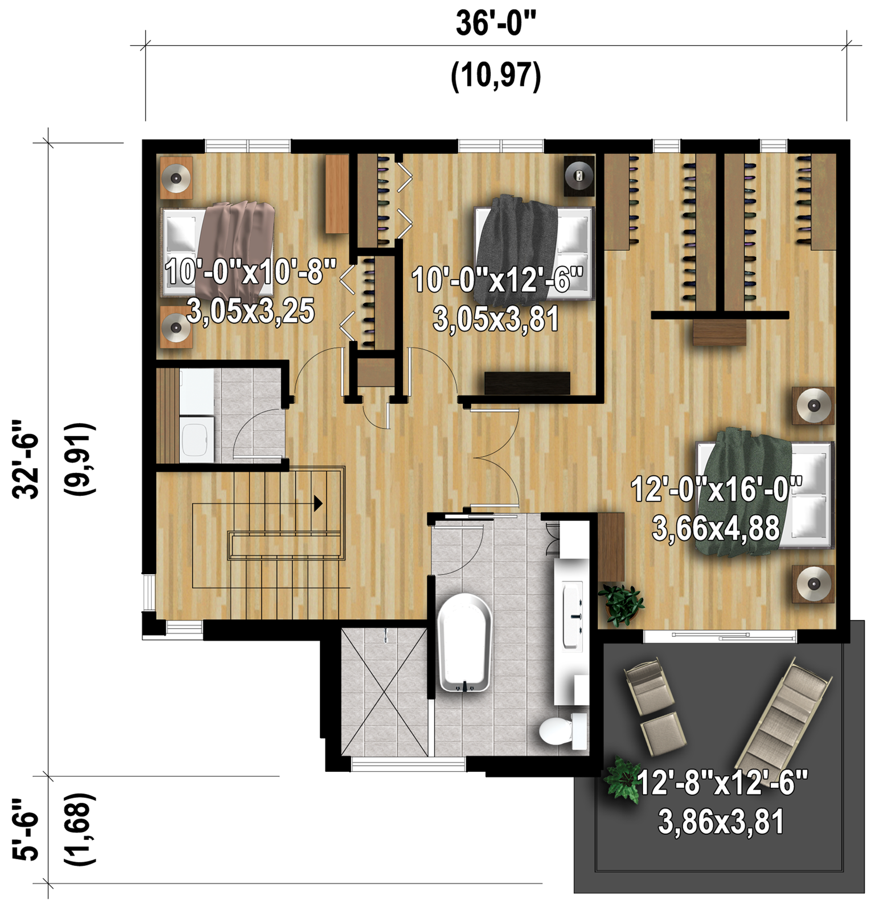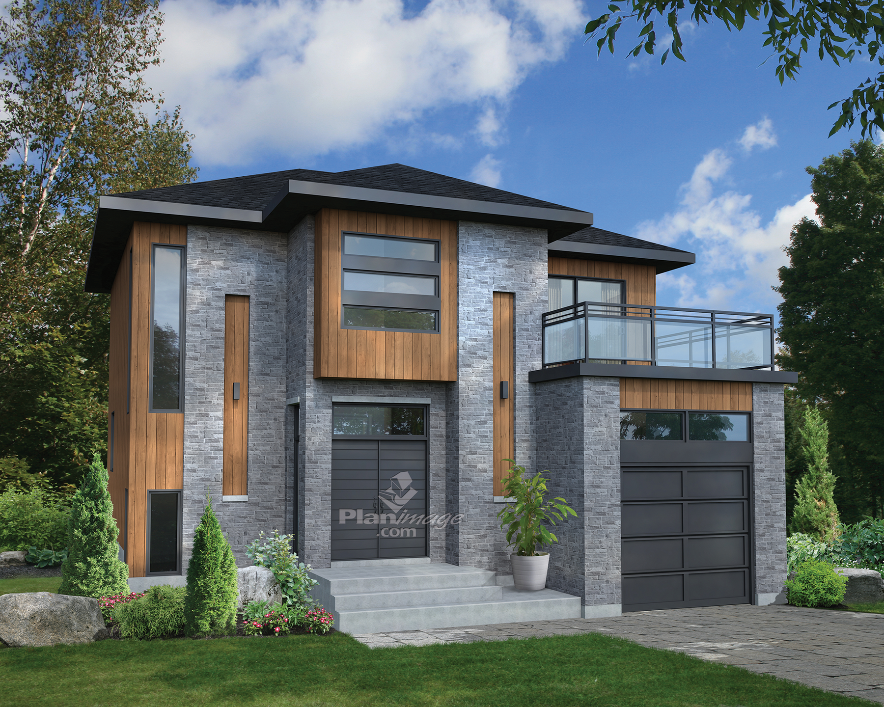 This splendid urban two-storey house stands out with its unique architecture, its brick and wood facing and its glass terrace above the garage. The house is 36 feet 5 inches wide by 38 feet deep, provides 1,909 square feet of living space along with a 272 square-foot one-car garage.