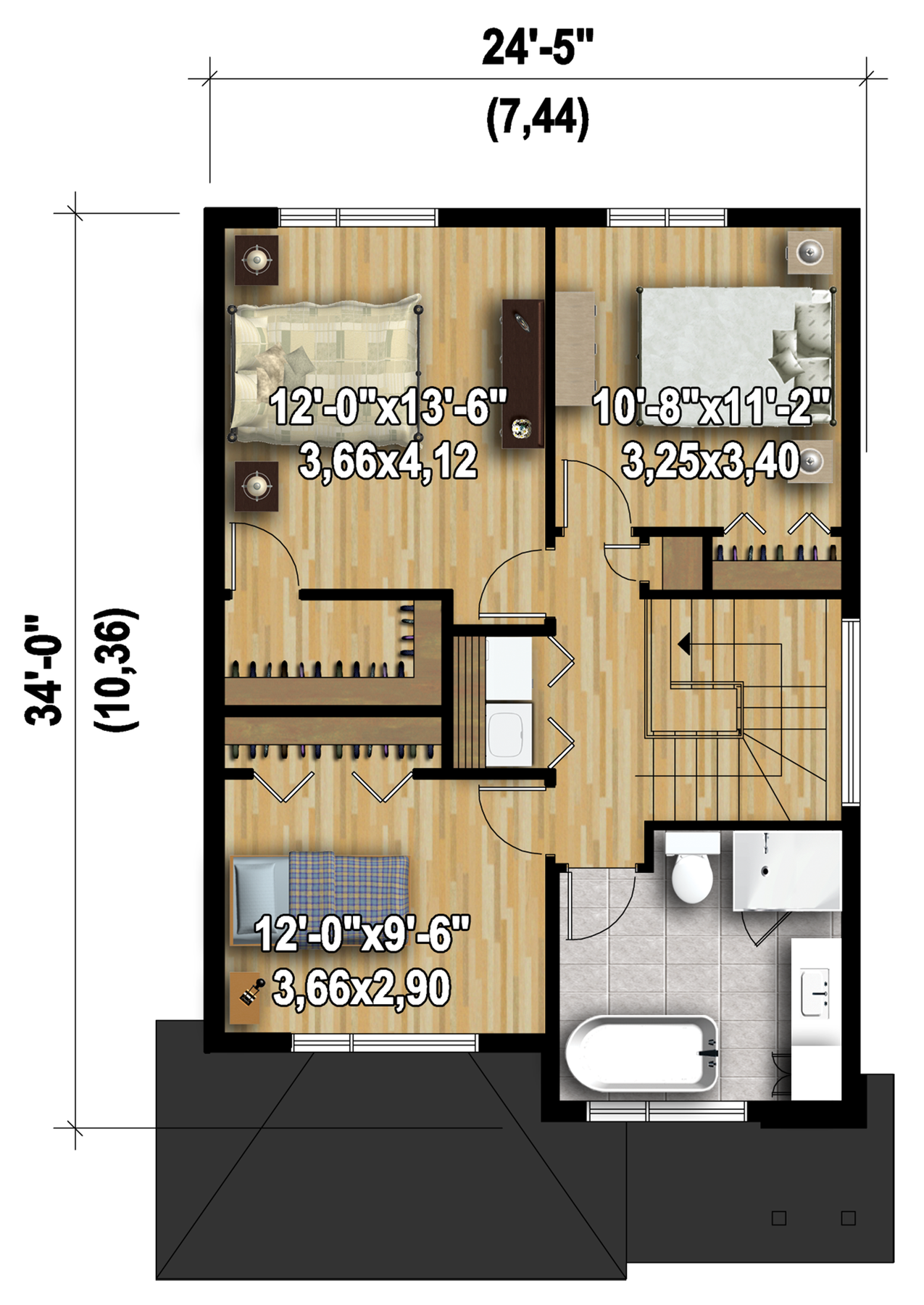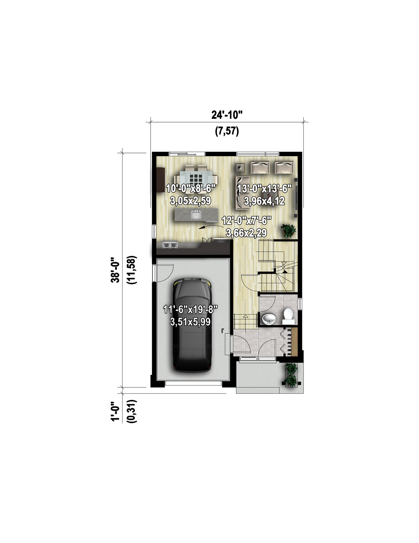 This elegant two-storey house has a definite urban style with its exterior facing of aluminum, stone and wood. The home is 24 feet 10 inches wide by 38 feet deep and has a 1,377 square-foot living area that includes a 268 square-foot one-car garage.