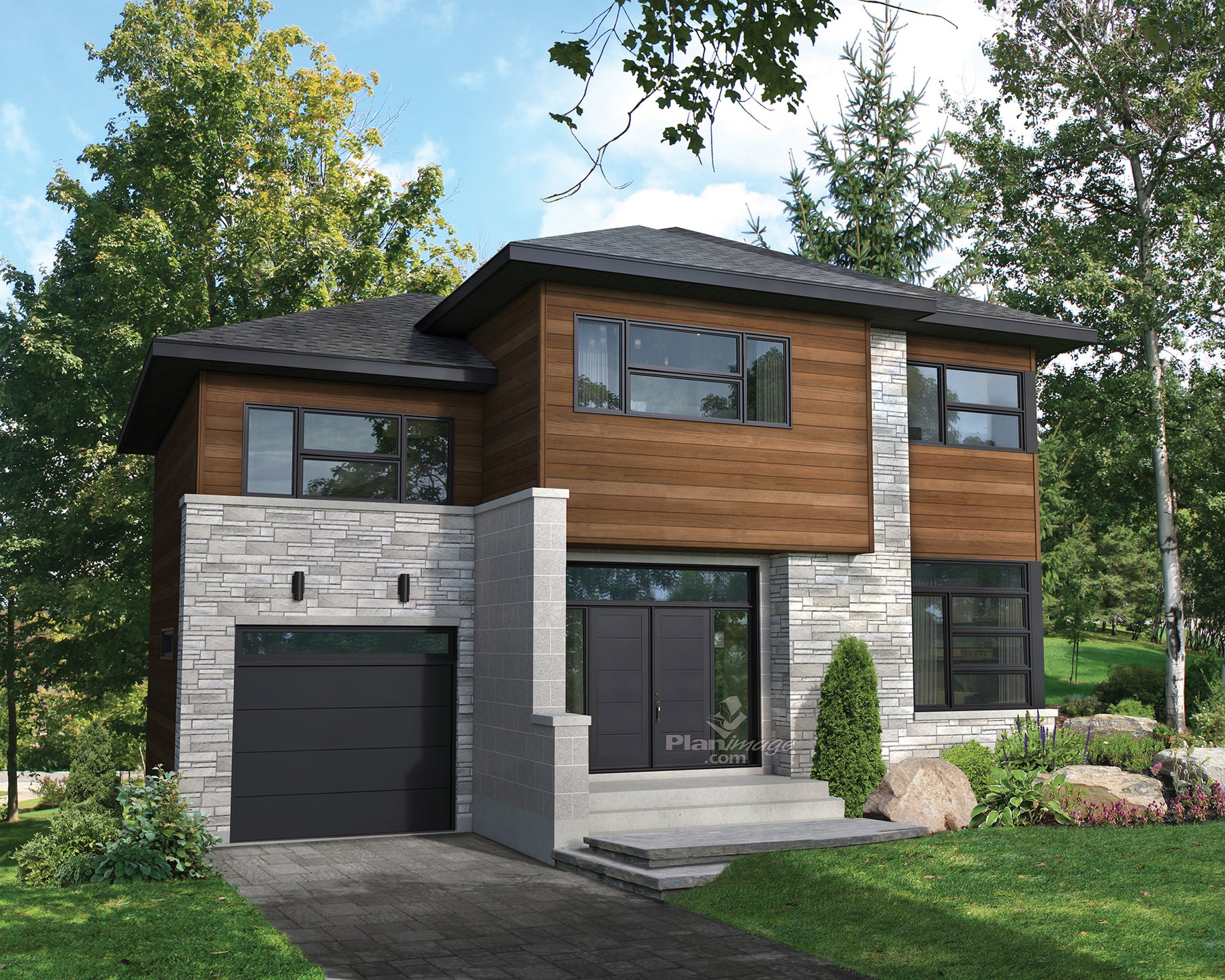 This elegant urban two-storey house stands out with its double entrance door and two side panels as well as its stone, wood and aluminum facing. The house is 38 feet 10 inches wide by 30 feet deep, provides 1,845 square feet of living space and has a 289 square-foot one-car garage.
