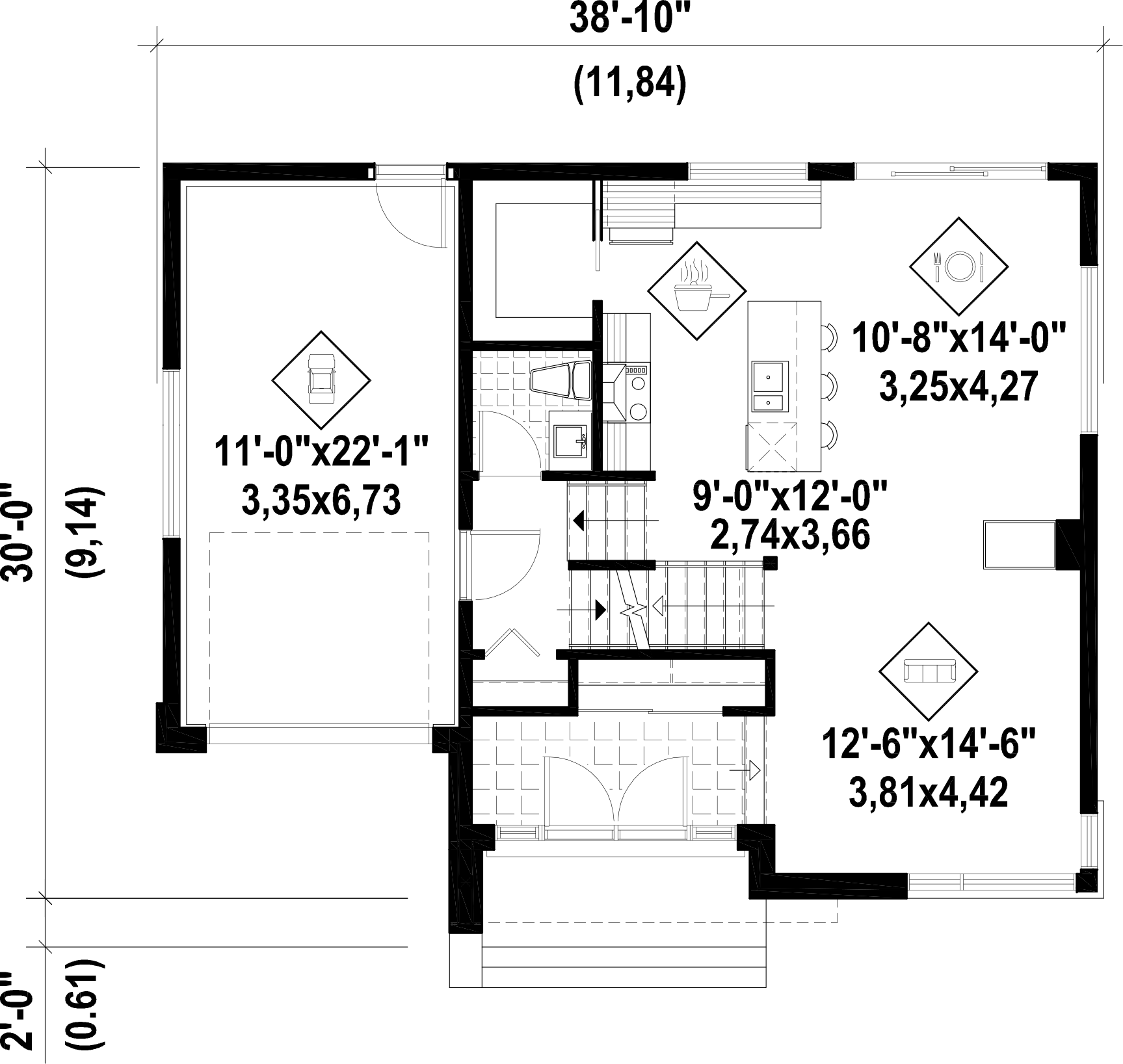| Front | 38 ft 10 in | Total living surface | 1845 ft² |