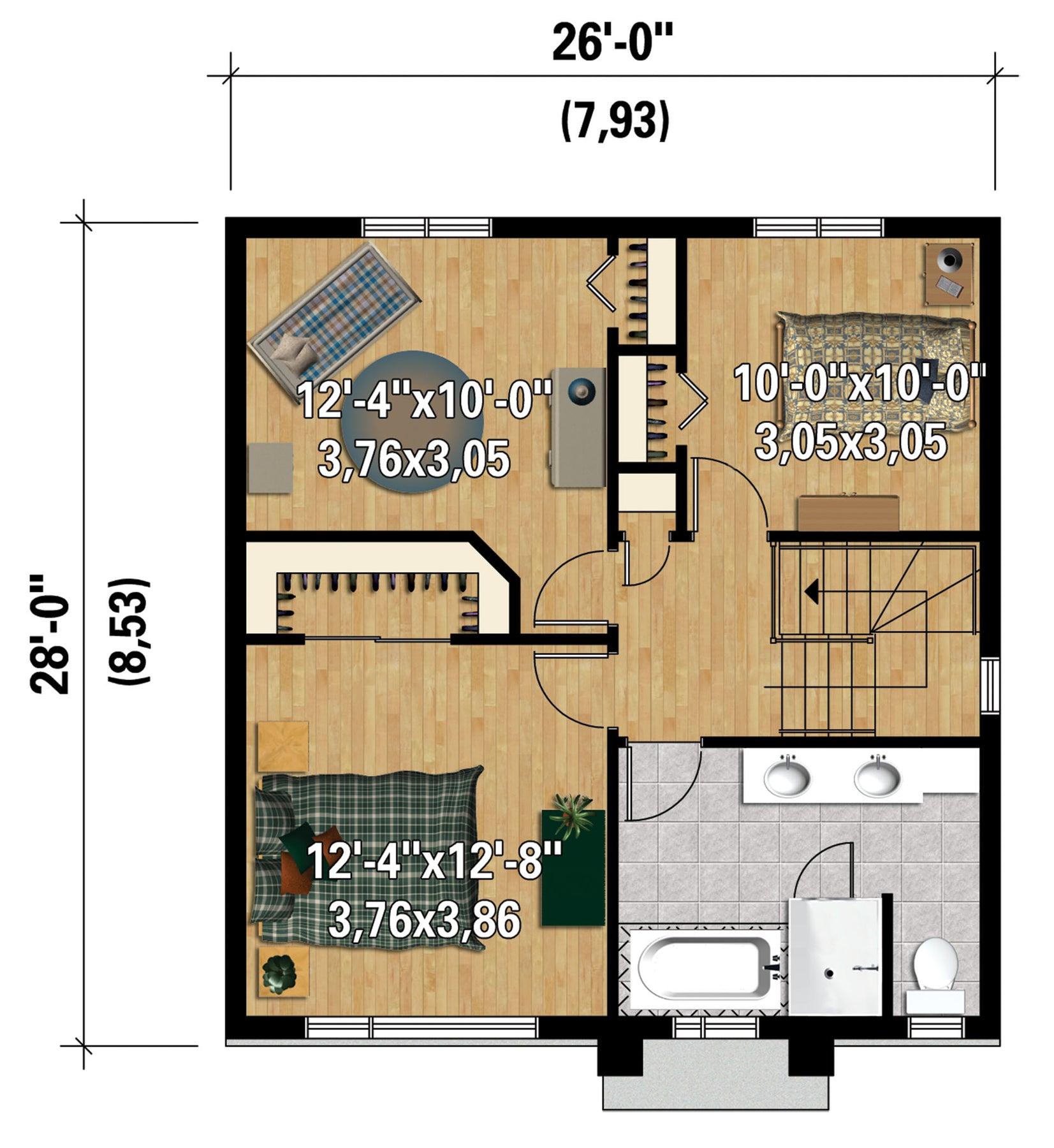 This lovely two-storey house looks elegant and welcoming thanks to the earthy shades of the stone and aluminum facing. The home is 26 feet wide by 28 feet deep and it provides 1,456 square feet of living space.