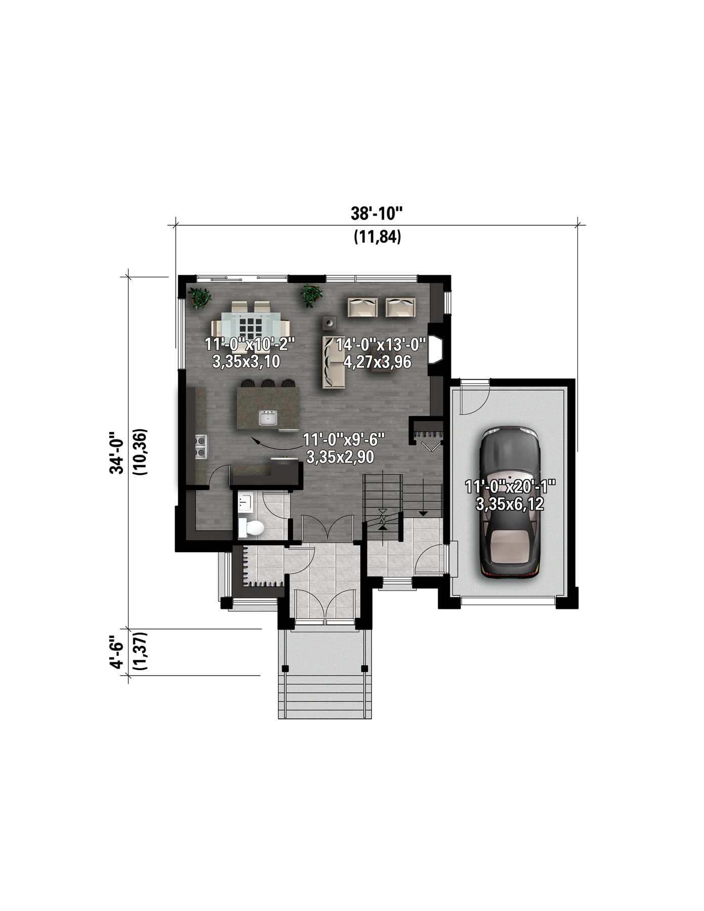 The grand entrance with its porch, the narrow full-height window, and the garage protruding forward give this two-storey house an impressive and original look. The home is 38 feet 10 inches wide by 34 feet deep and provides 1,896 square feet of living space in addition to a 267 square-foot one-car garage.