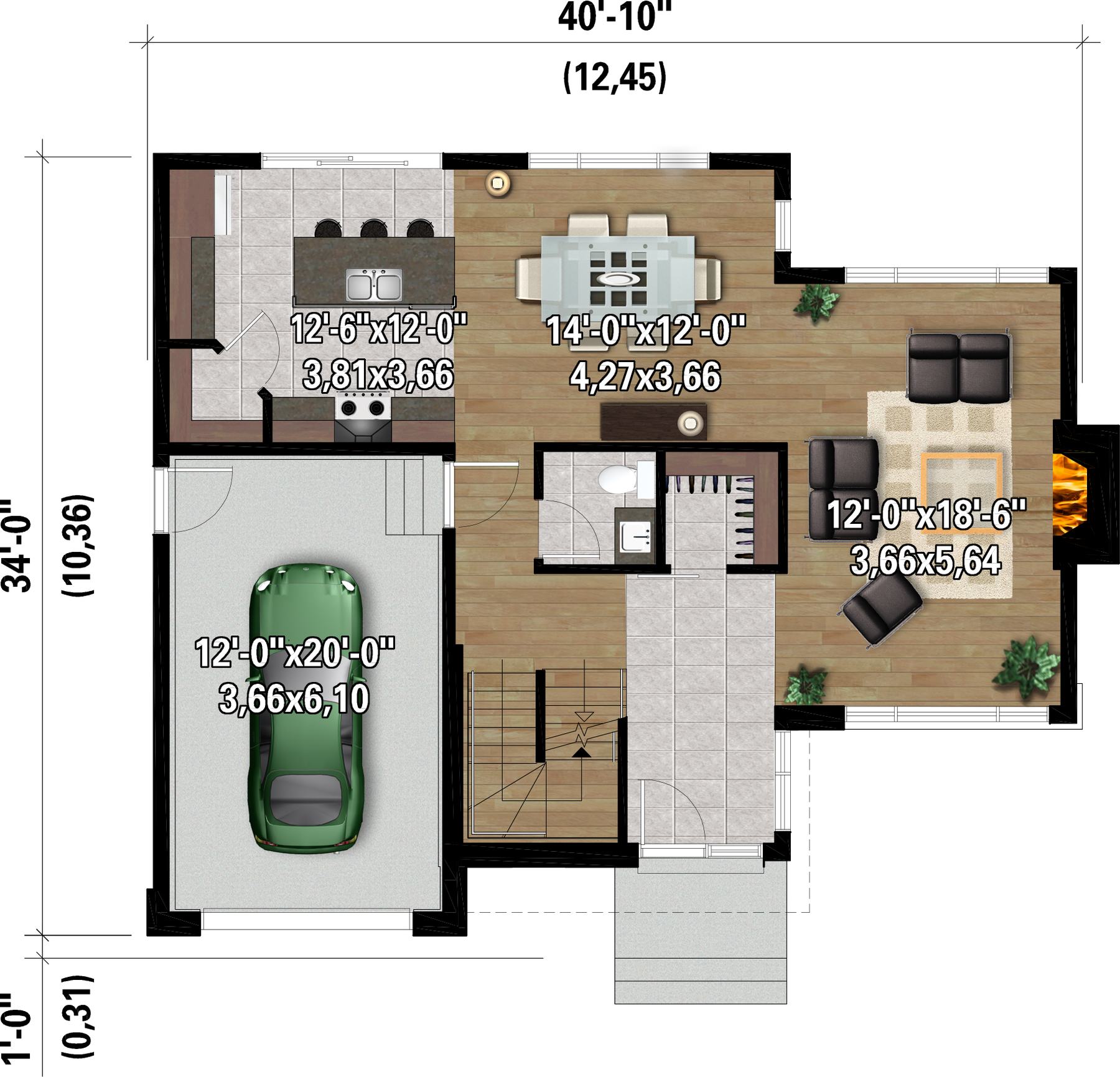This urban-looking single-story home measures 40 feet wide by 34 feet deep and offers 1,771 square feet of living space. With 266 square feet, the garage can accommodate one car.