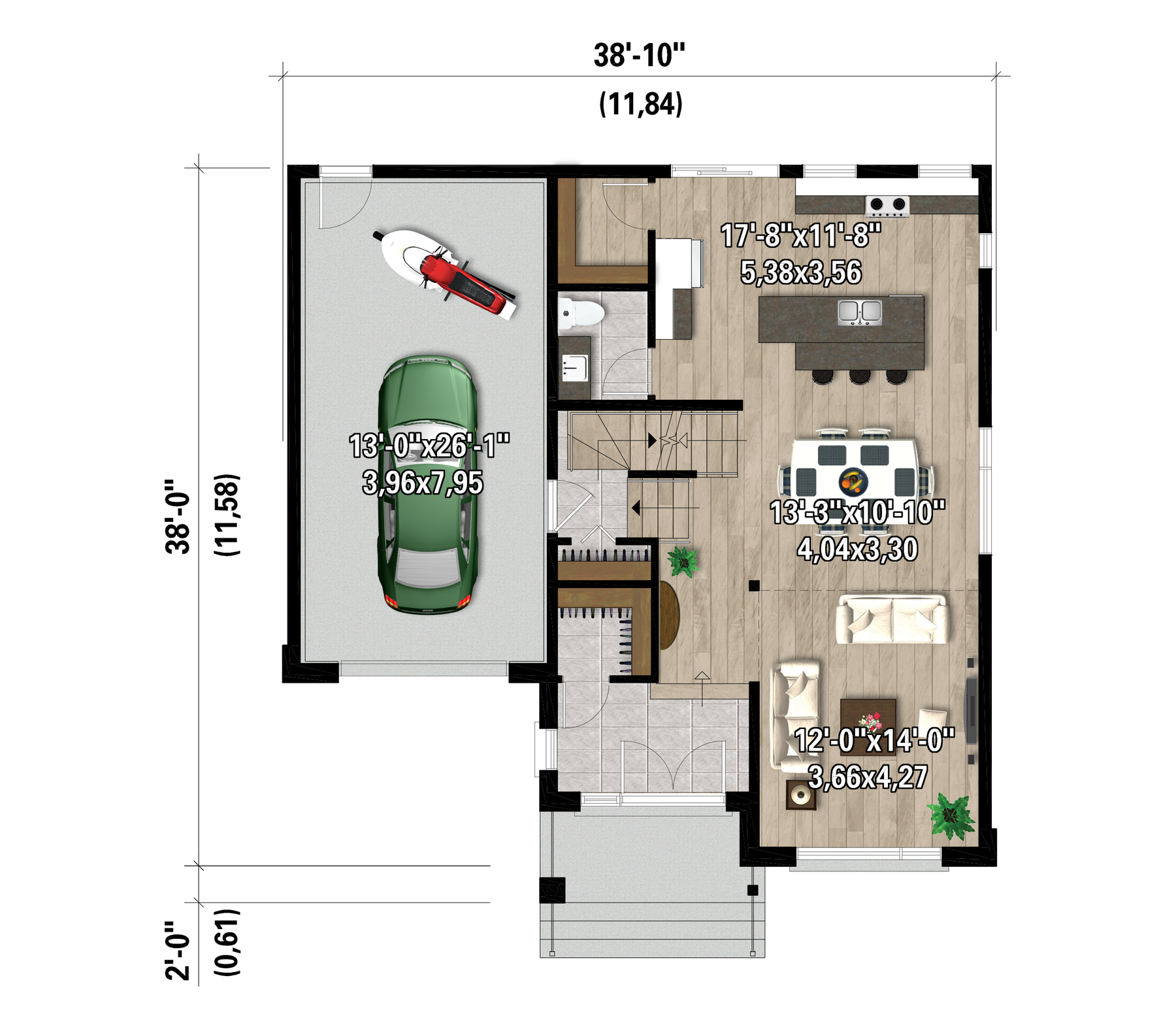 | Front | 38 ft 10 in | Total living surface | 1970 ft² |