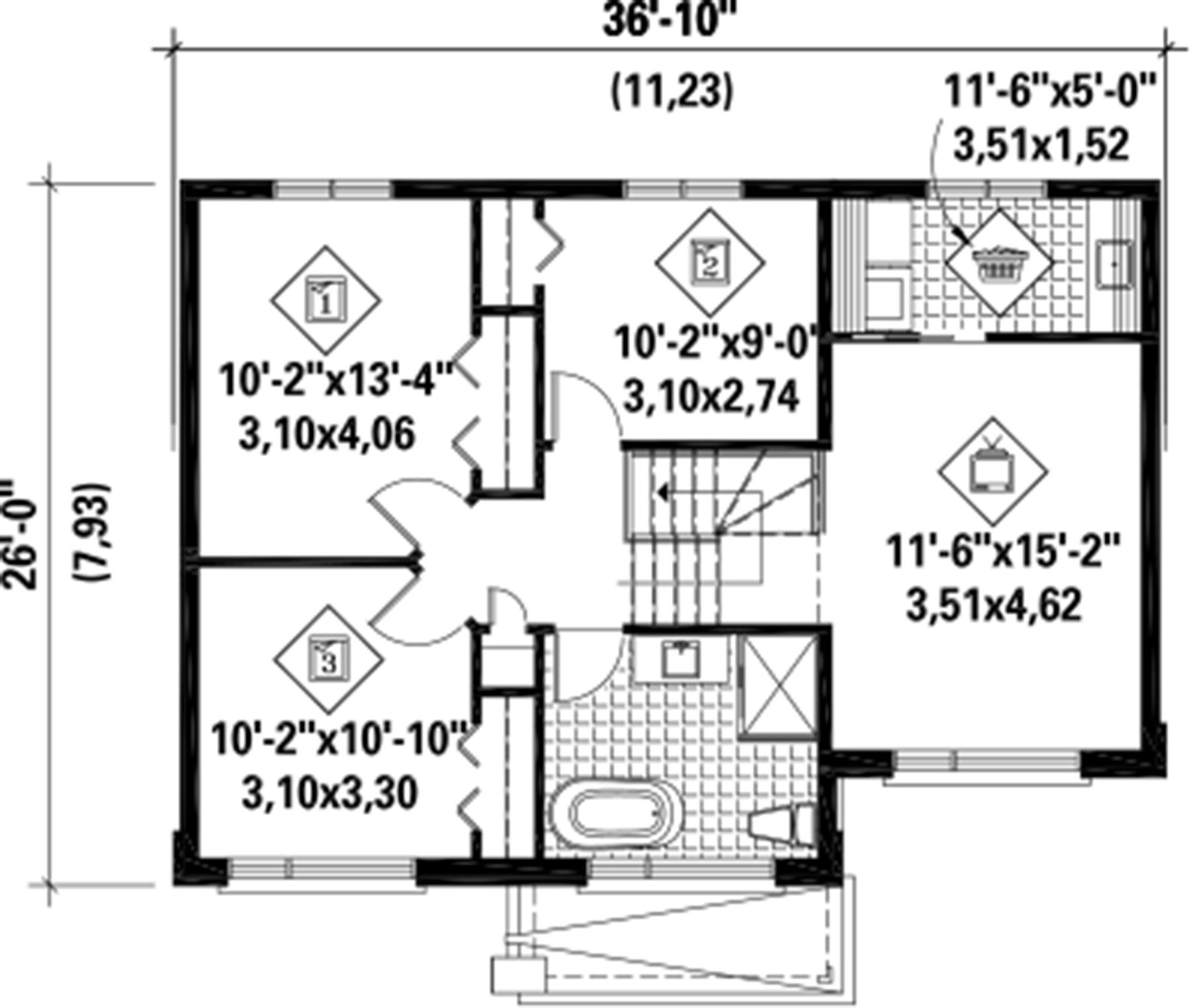 | Front | 36 ft 10 in | Total living surface | 1518 ft² |