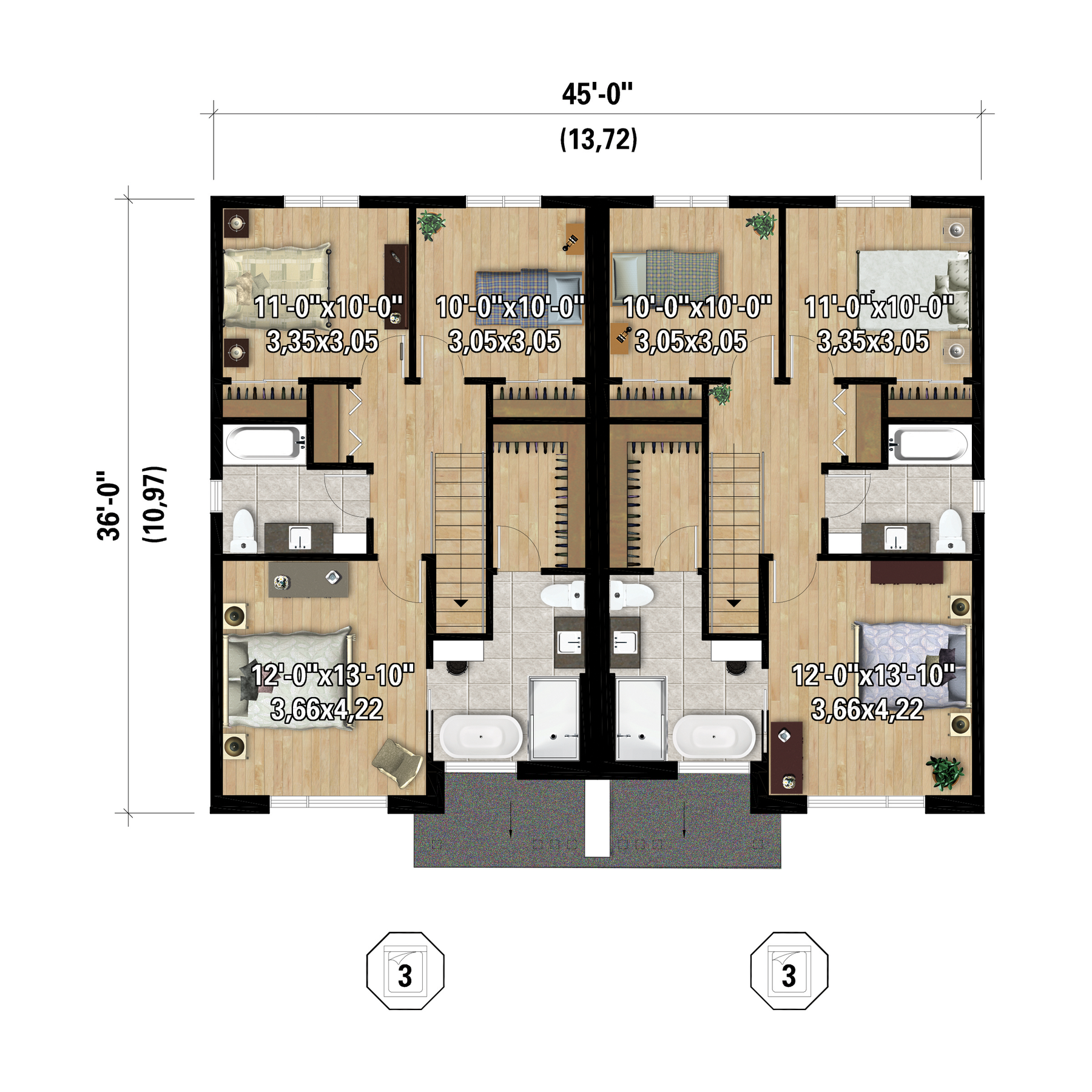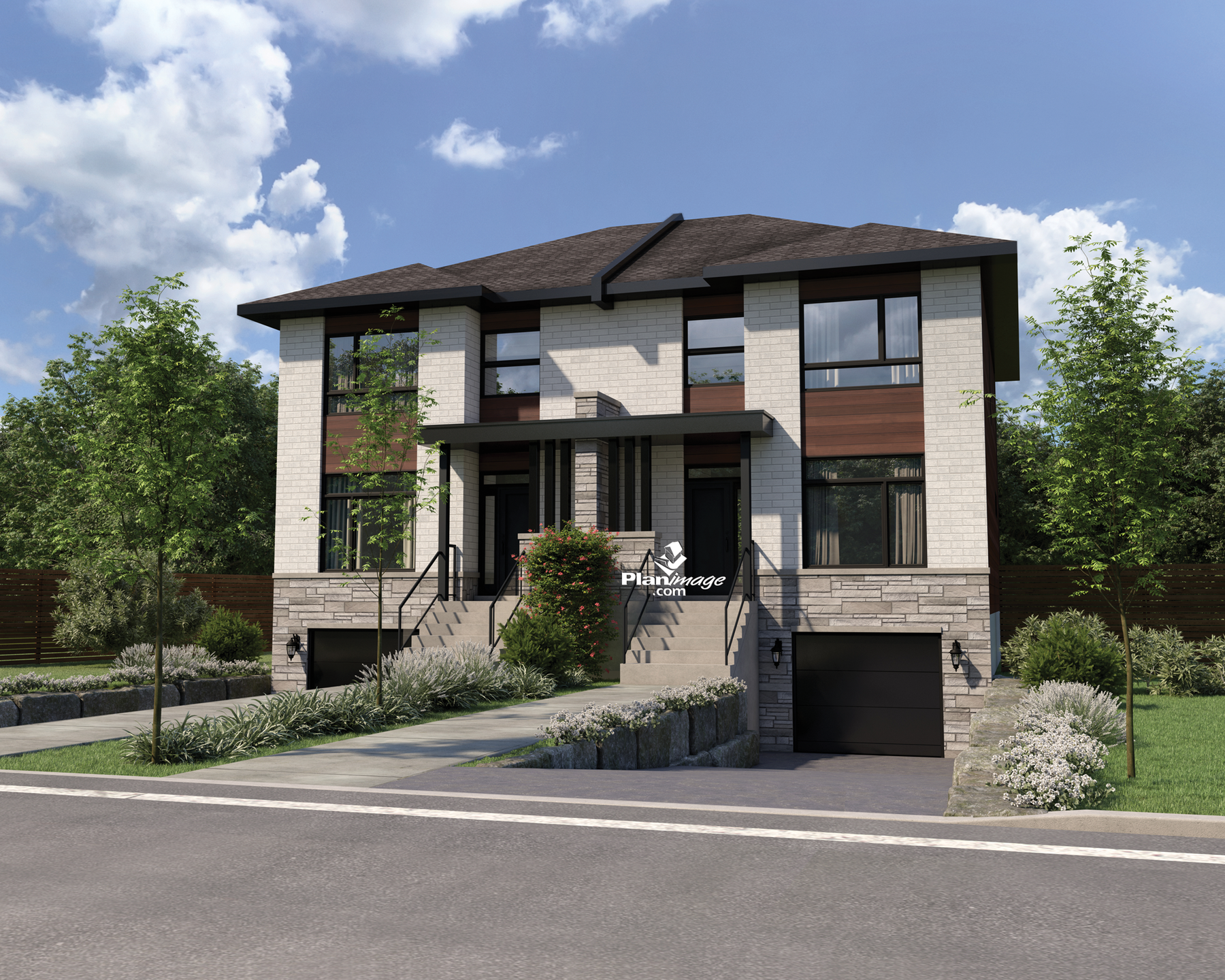 These semi-detached houses have a look of elegance with their stone entrances and many windows. In total, the livable surface area is 4,224 sq. ft. The two one car garages have a total area of 530 sq. ft.